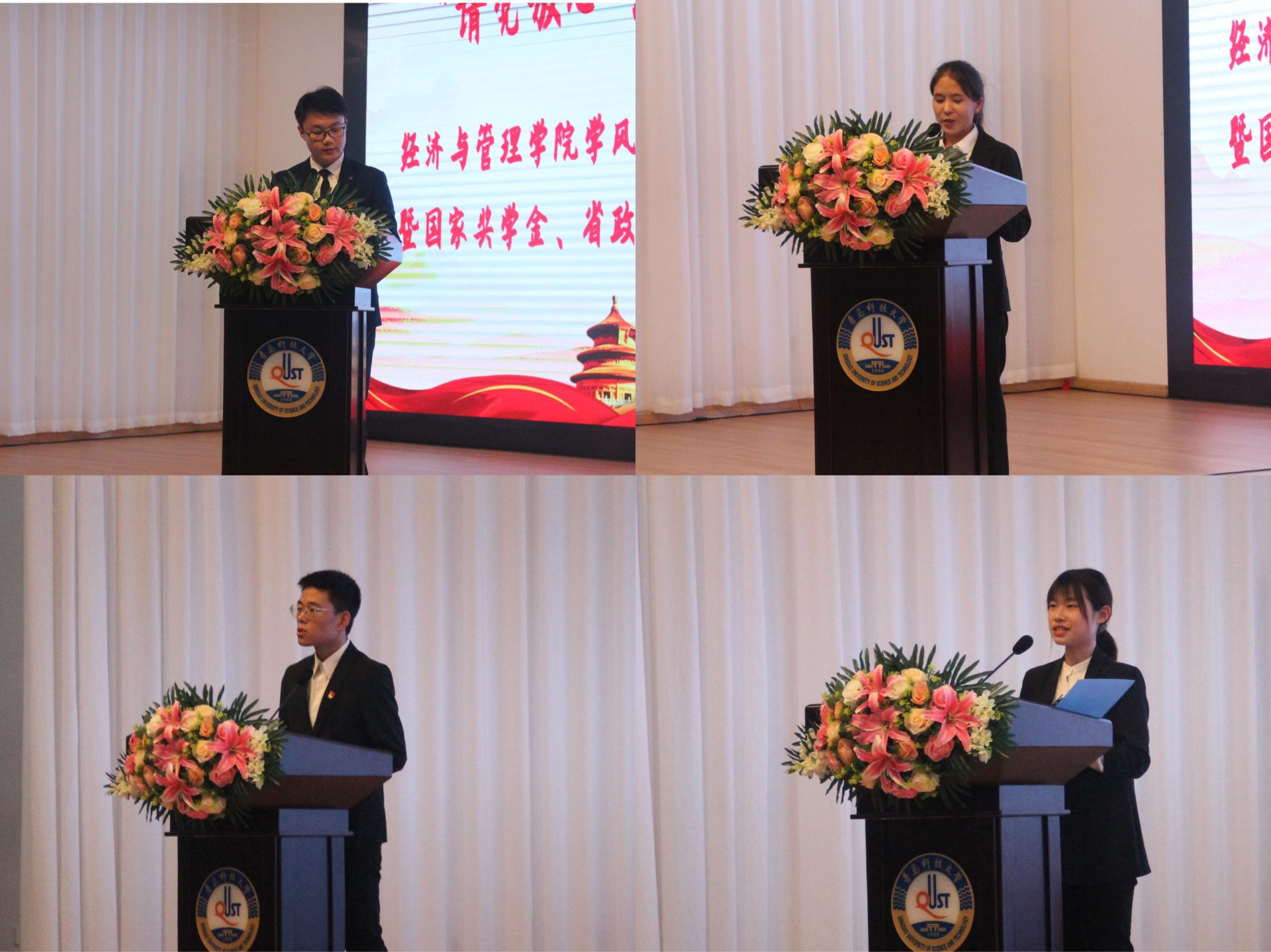 为推进学院学风建设,促进大学生健康成长和综合素质全面提高,进一步营造良好的学习氛围,提升学业质量,助力学科高质量发展。10月7日晚,经管学院于第二报告厅举行“请党放心 强国有我”学风建设月启动仪式暨国家奖学金省政府奖学金答辩会。党委副书记兼副院长刘跃宁、副院长宫攀、各系主任、全体专兼职辅导员及部分学生代表参加会议。