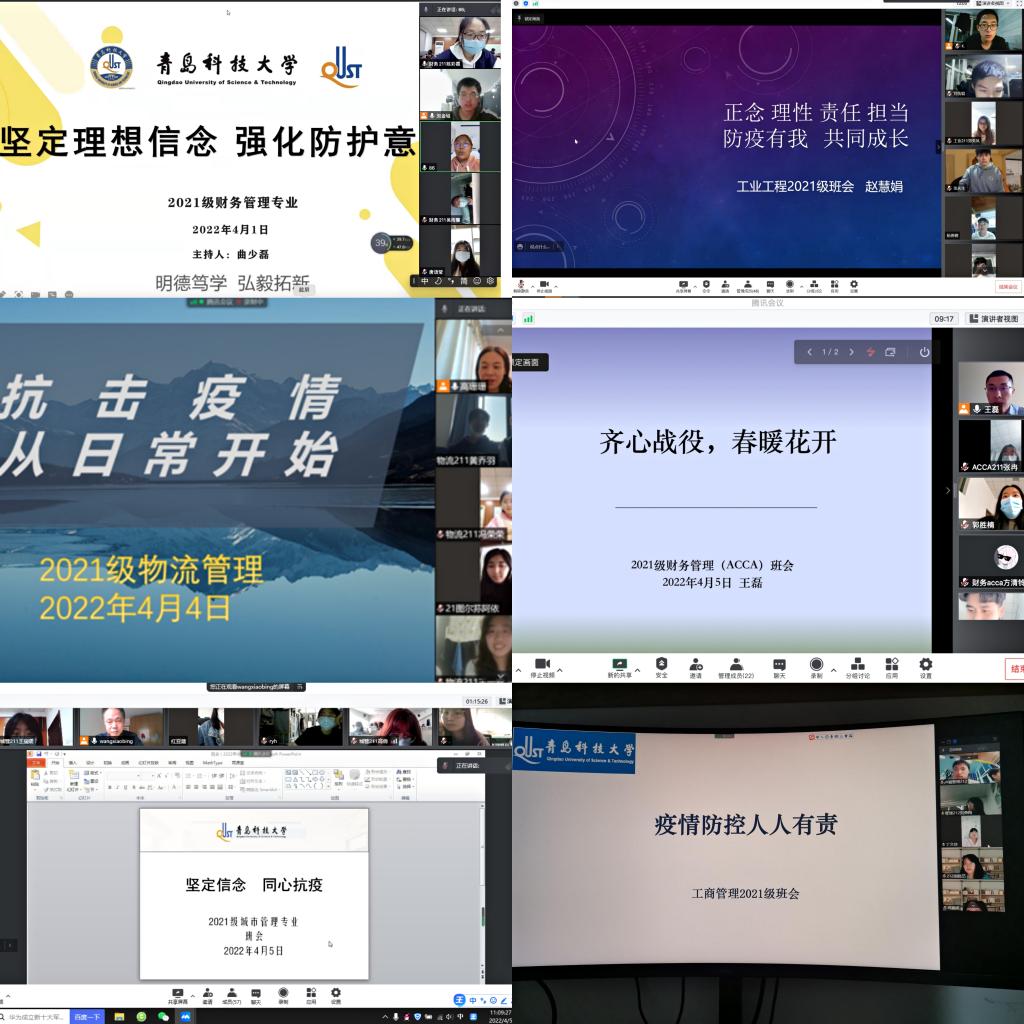 疫情就是命令,防控就是责任。在校园疫情防控关键时期,为贯彻学校、学院防疫要求和部署,坚定学生打赢疫情防控阻击战、遭遇战,筑牢疫情防控的“铜墙铁壁”,4月2日以来,经管学院2021级充分发挥班主任育人作用,组织各专业班主任开展线上班会,各班主任立足相关专业学生特点及工作重点,将疫情防控与思想政治教育相结合,缓解疫情背景下同学们的紧张焦虑情绪,深切关怀学生的身体心理健康和学业状况,引导大家凝心聚力打赢疫情防控战。