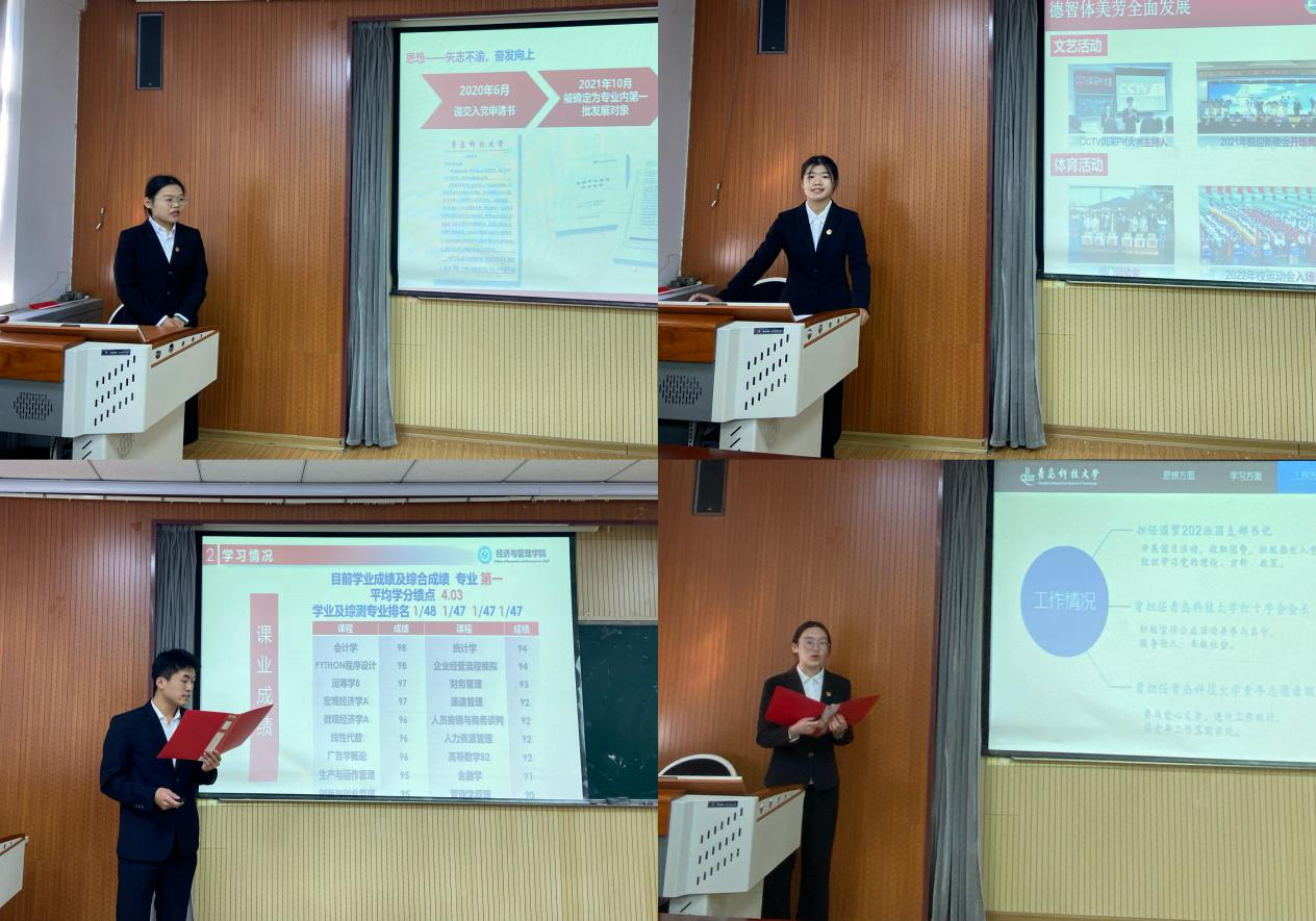 为充分发挥榜样示范作用,启动仪式结束后,学院举行了2021-2022学年山东省国家奖学金、省政府奖学金答辩会。国贸191班王孟轩、财务(ACCA)191班王荔荣、物流192班王琳斐、财务191班张帆、物流192班李婕、工业191班曾梅花、营销202班王率龙、国贸202班刘汝童、管理202班苗孟飞、国贸202班闫佳琪、财务212班张一豪、管理211班胡尊鑫12名候选学生依次上台,从思想品德、学术科研、社会实践、服务同学等方面进行自我展示,充分展现了经管学子勤学善思、明辨笃行优秀品质。经学院奖学金评审委员会成员公开投票,财务191班张帆、工业191班曾梅花同学获得2021-2022学年国家奖学金。