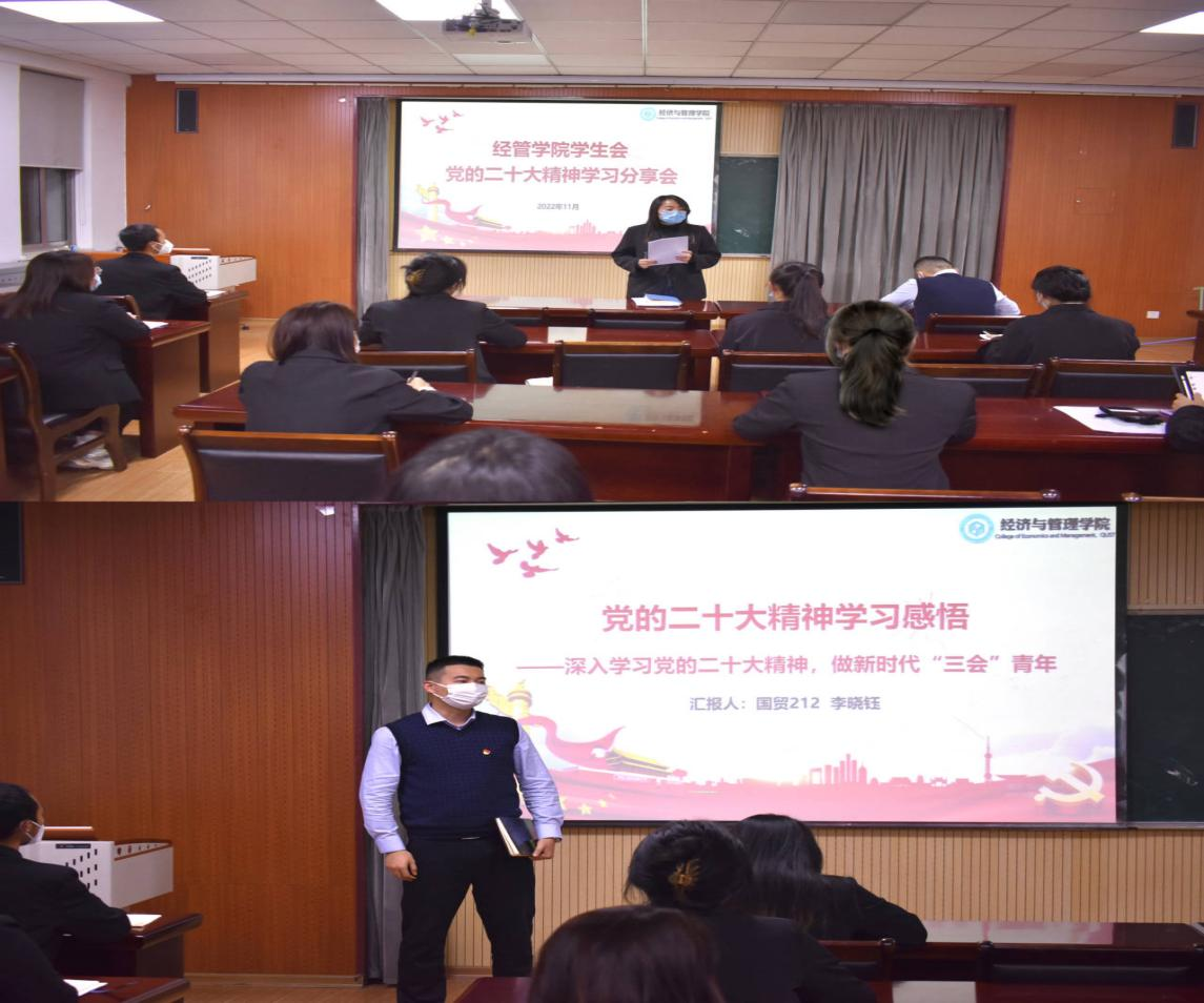 为更好地贯彻落实党的二十大精神,坚定不移引领青年学子沿着习近平总书记指引的方向奋勇前进,为中国式现代化伟大实践贡献青春力量。11月22日晚,经管学院学生会于经管楼419召开了党的二十大精神学习分享会,学生会指导老师付凯、袁绍正出席会议,全体学生会骨干参与会议。