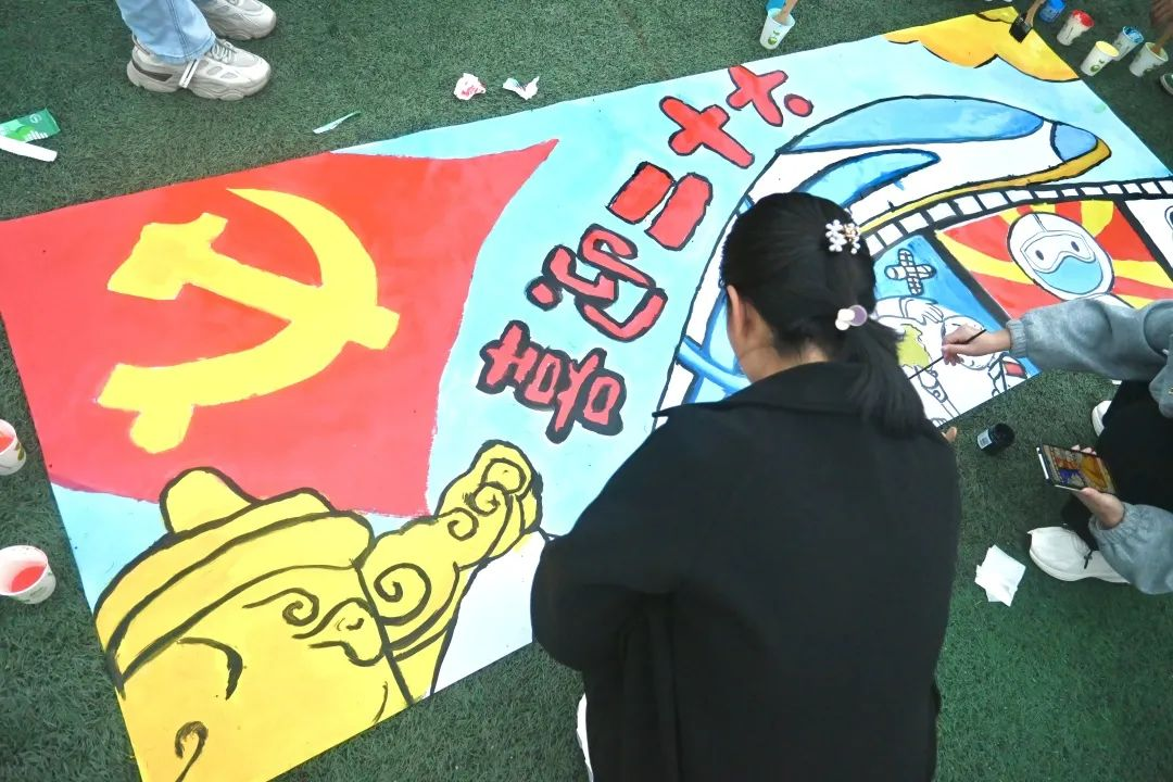 绘画结束后,同学们发自内心地对新时代的崇敬、对祖国的热爱、对奋进新征程的自豪油然而生。一名参与活动的同学激动谈到:“我们画的不仅是祖国的美好成就,更画出了我们的当代青年的无限自豪与时代重任。我们会勇于担当时代重任,接过历史接力棒,以实际行动在实现社会主义现代化国家的征程中谱写青春华章。"