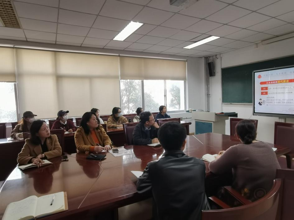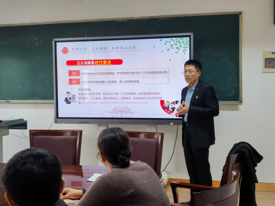 宣讲以人才为切入点,阐述三大战略的贯彻与落实需要握稳优先发展教育事业的"方向盘"、需要夯实科技创新治理体系这个"压舱石"、需要答好培育拔尖创新型人才这个"大考卷"。同时号召广大老师牢记教育初心,不忘为党育人、为国育才使命,把立德树人贯穿到工作各个环节,做好学生为学、为事、为人的大先生。