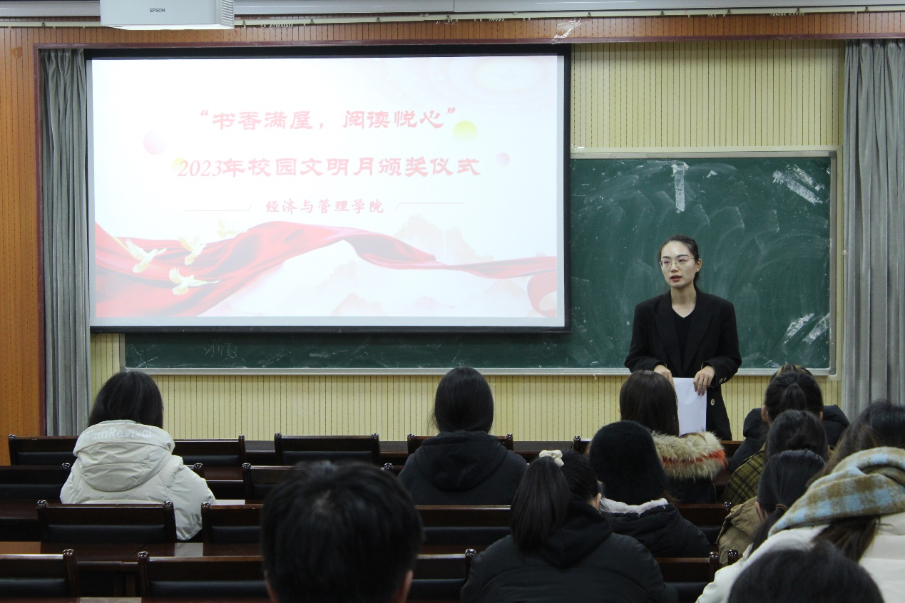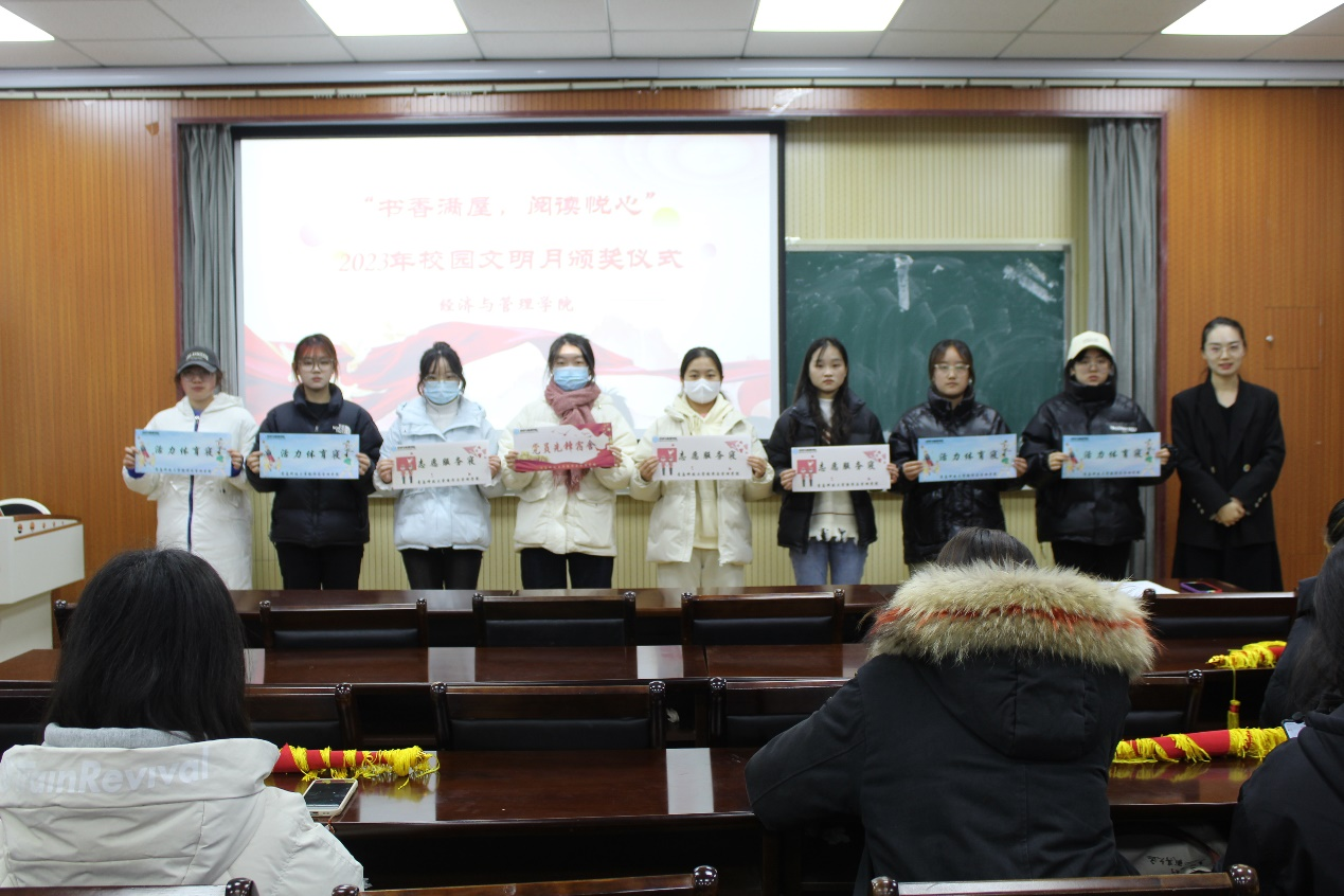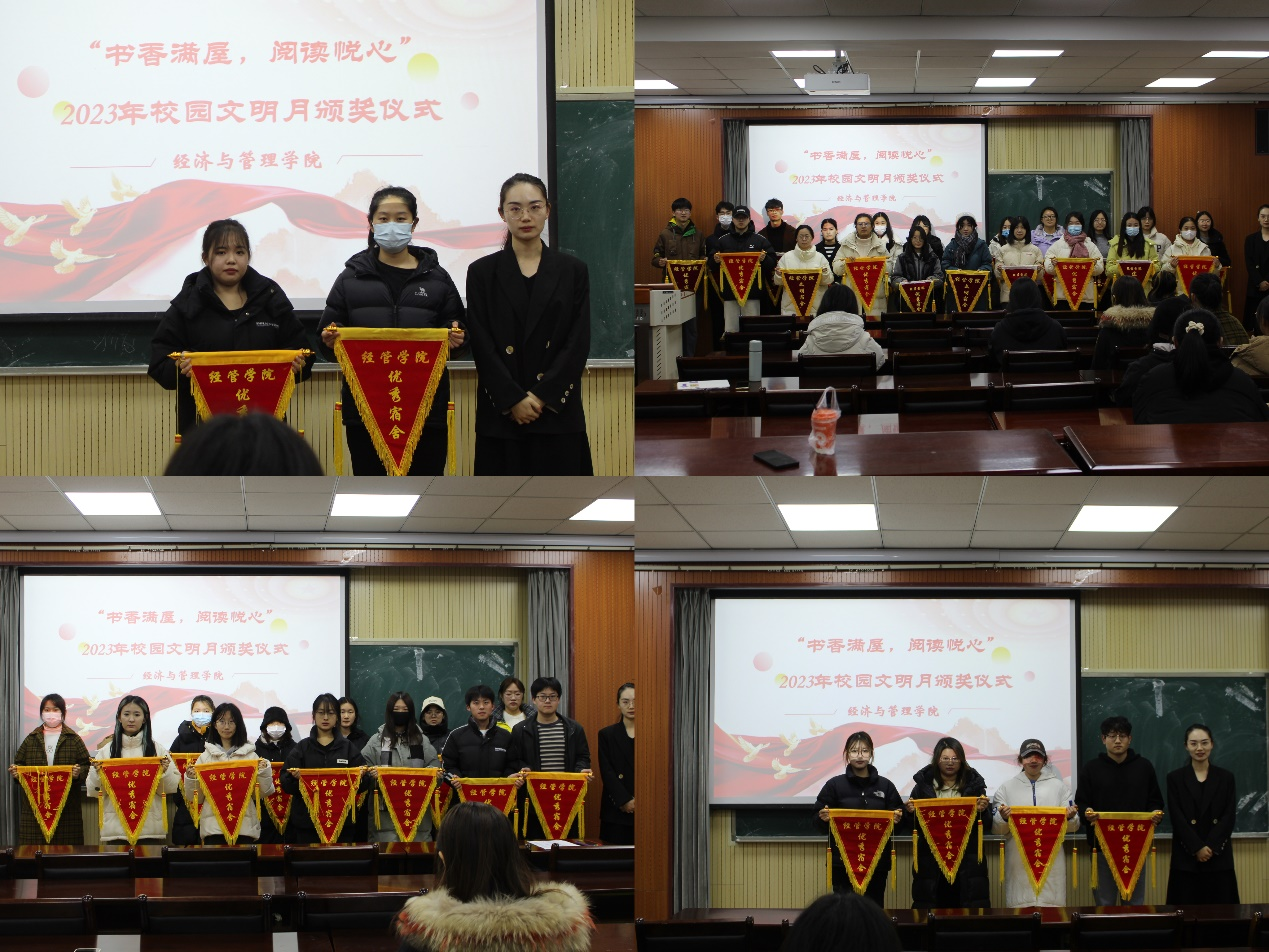 为建设文明校园,创造干净整洁、明亮清雅的宿舍环境,进一步培养经管学子良好的生活习惯,创建整洁、文明、舒适、优美、规范的生活环境,展现经管学子同心向党、积极向上的精神风貌,2023年12月14日,经管学院于经管楼419举办“书香满屋,阅读悦心”校园文明月优秀宿舍表彰大会暨颁奖仪式,学院分团委老师占晓祎出席活动。