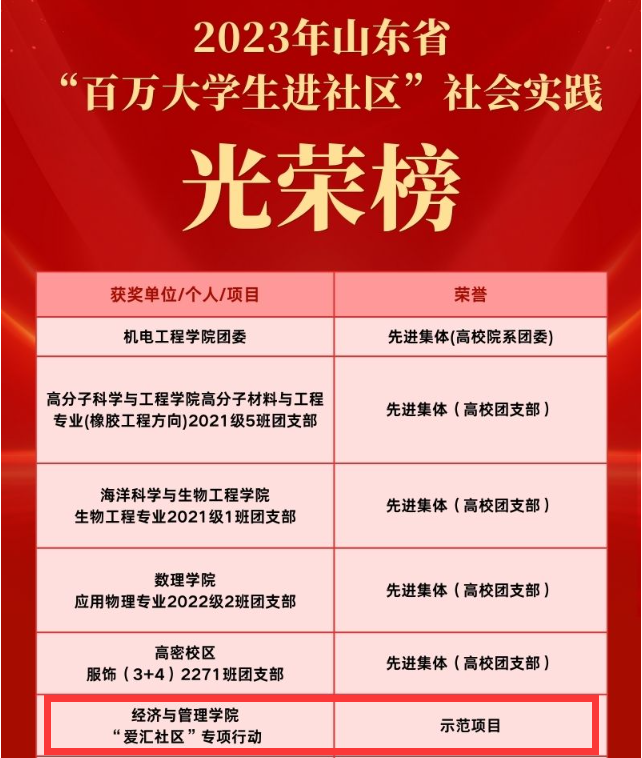 近日,共青团山东省委公布了2023年度“百万大学生进社区”社会实践项目表扬通报名单,德赢官网“爱汇社区”专项行动获“示范项目”表彰。