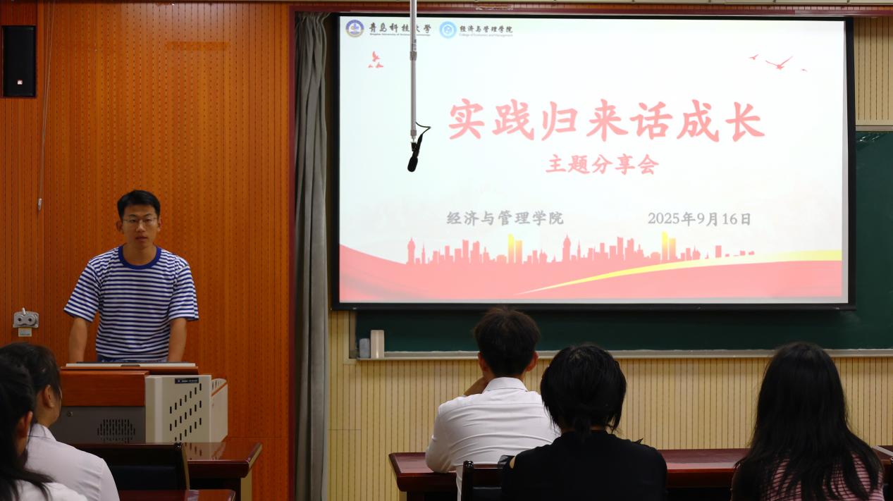 为深化实践育人和“大思政课”工作成效,巩固暑期社会实践成果,引导青年学生在社会实践中“受教育、长才干、作贡献”。9月16日晚,经管学院在505会议室举办“实践归来话成长”主题分享会。辅导员孙建树、吕欣哲,各年级暑期社会实践成员、25级新生代表参加本次活动。