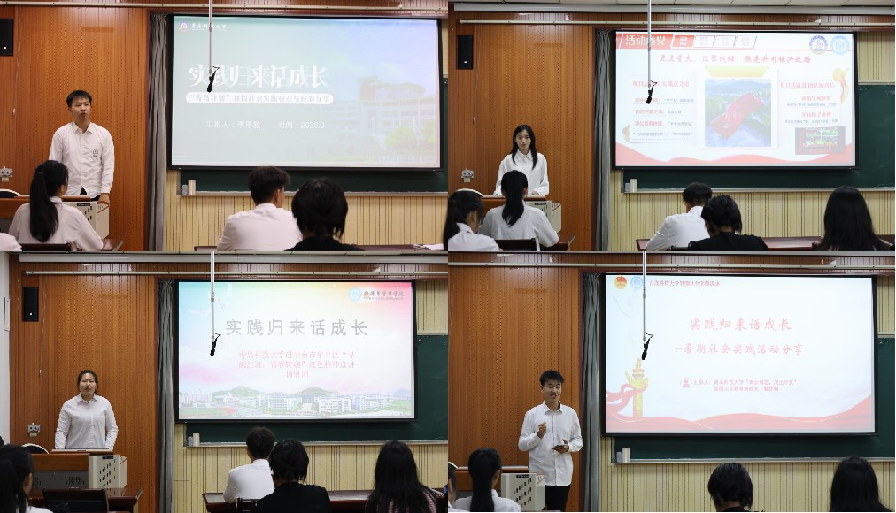 “寻韵红迹,青春铸魂”红色精神宣讲调研团的张群敏以“红色精神的时代内涵”为主题,结合实地调研资料,深入解读沂蒙精神和胶东革命精神的核心要义。参加“青鸟计划”暑期政务实践的李泽毅讲述了“从办公室的文件整理,到田间地头的调研走访”助力乡村振兴的经历,分享了对政务实践的深刻认识。“青云有志,沈土寻英”爱国主义教育实践团的董仕翰以“新时代青年的爱国担当”为主题,分享了团队在多地开展爱国主义宣讲的实践经验。“井冈情・中国梦”革命老区生态振兴团的白雨涵以团队在井冈山的调研历程为主线,介绍了井冈山在生态保护与产业发展方面的探索成果。崂山区同盛路社区“童乐营”实践团的李朝馨展示了为留守儿童辅导作业、组织红色故事小课堂的温暖瞬间。
