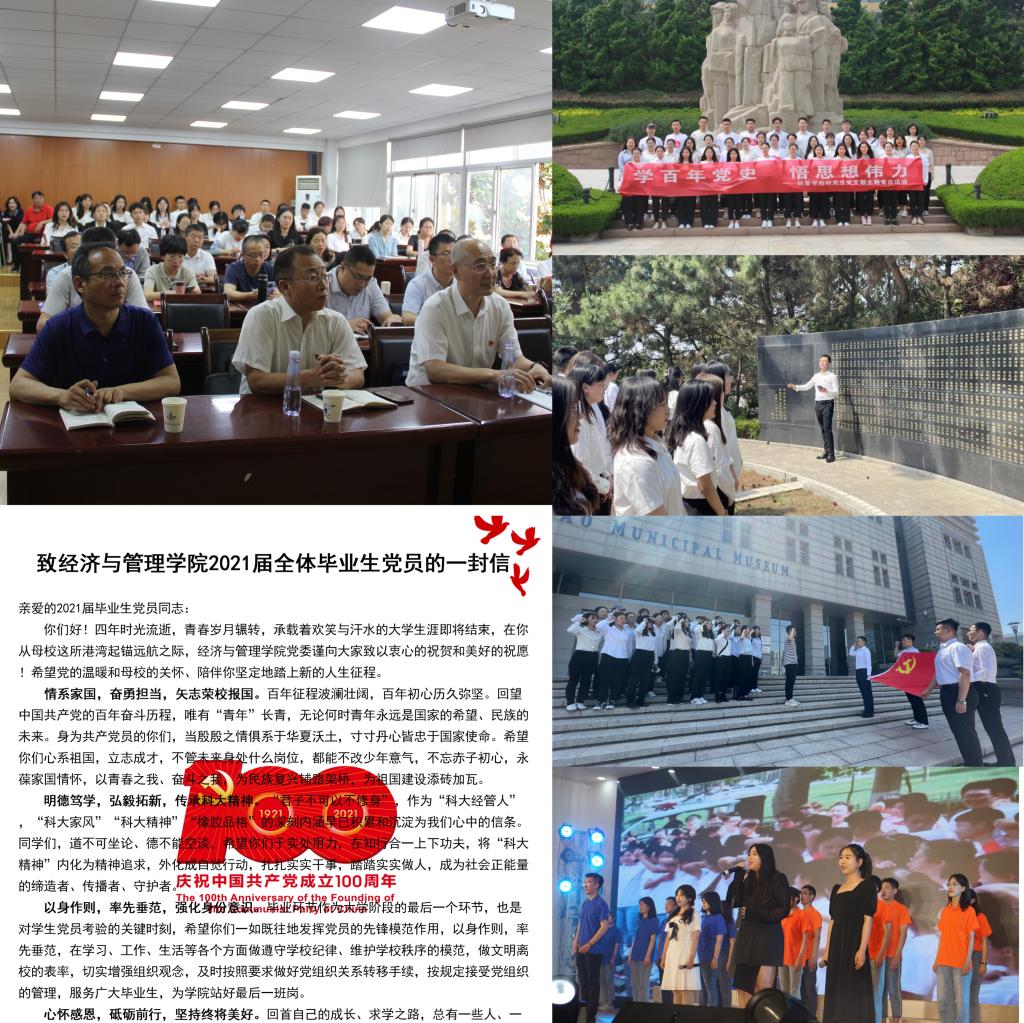 经管学院进一步强化毕业生党员的宗旨意识和责任意识,以陈克正校长“学习弘扬长征精神推进学校高质量发展”专题党课为契机,引导毕业生党员将不忘初心传承百年党史,牢记使命弘扬长征精神,重新走好新一代青科大人新时代的长征路。学院举办庆祝建党100周年文艺汇演暨2021届毕业生“奋斗·强国”毕业嘉年华启动仪式,围绕建党百年历程,表演反映不同历史时期的主旋律歌曲、舞蹈、语言等类别的节目,打造一场立德树人、爱国爱党的思政大课。组织毕业生前往焦裕禄干部学院、中共青岛党史纪念馆、崂山革命烈士陵园、马克思主义学院“社会主义五百年”主题教育基地、学校党史学习教育打卡地等地进行现场教学,强化毕业生爱党爱国重要使命。学院各党支部组织开展“了解党旗党徽”、“青年党员说百名党史”、“唱支山歌给党听”、重温入党誓词、“学党史走好来时路,铸信仰走好新征程”等系列主题教育活动,引导广大毕业生党员把青春梦融入中国梦,让个人的青春理想在实现中国梦的伟大征程上绽放光彩。组织发布《经管学院致2021届全体毕业生的一封信》和《致经管学院2021届毕业生党员的一封信》,引导毕业生在融入家国梦、青春献祖国中书写人生华章。