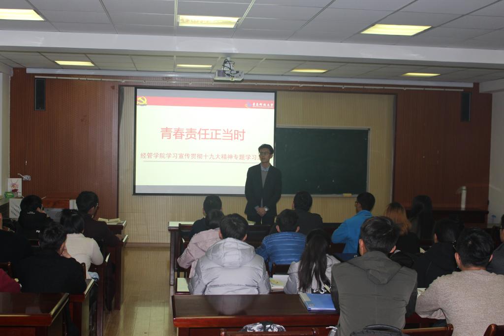 11月26日,经管学院在419会议室召开2017级学生干部培训会暨养成教育专题学习会。会议以“学习宣传贯彻党的十九大精神,青春责任正当时”为主题展开,以提升学生干部责任意识和纪律观念,增强学生干部的工作能力。2017级辅导员张显全、王景雯及主要学生干部参加了此次会议。