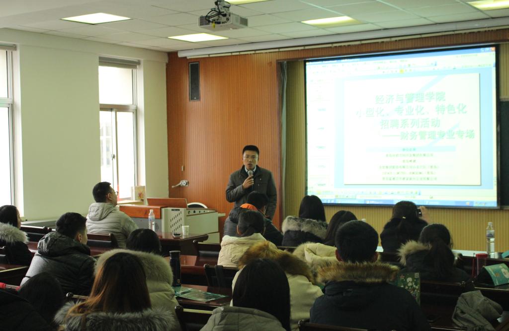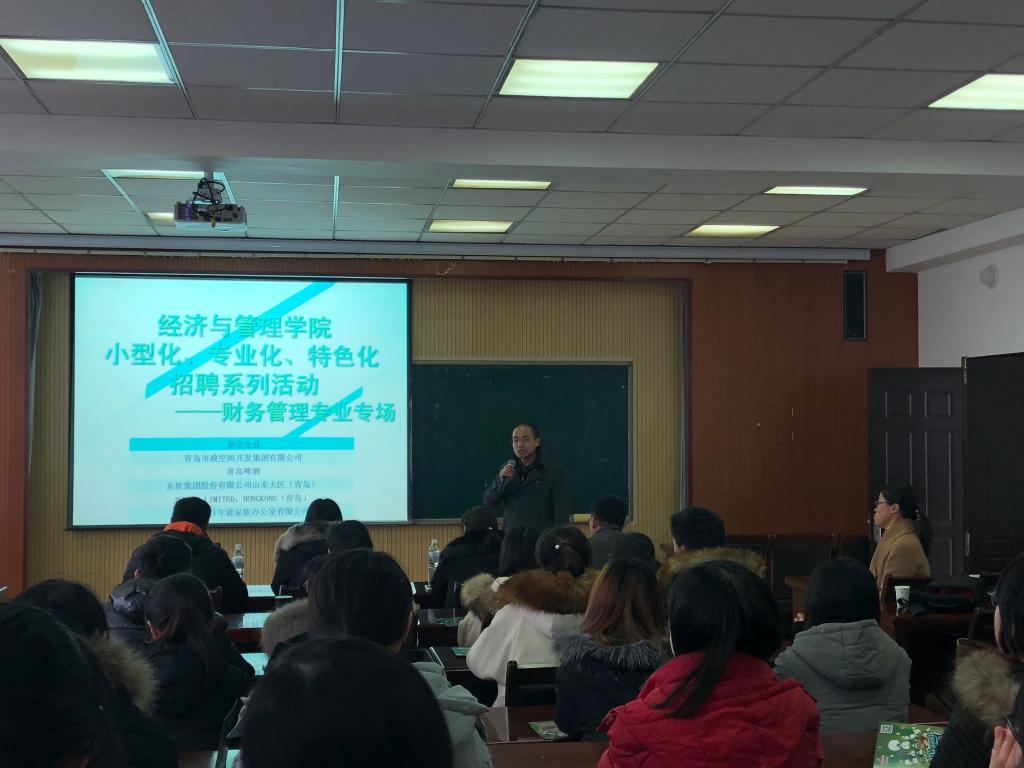 12月15日下午,德赢vwin体育官网登录小型化、专业化、特色化招聘系列活动——财务管理专业专场在经管楼419室成功举办,青岛啤酒山东大区财务总监王国清\青岛市政空间开发集团有限公司子公司财务总监李翠艳、东软集团股份有限公司山东大区财务总监高雪松、JSPACE LIMITED HONGKONG(青岛)财务总监薛红梅、青岛百年渡家族办公室有限公司行政经理孟丽君代表企业前来招聘。经管学院财务与会计学系主任张占贞、副主任于培友主持了本次活动。