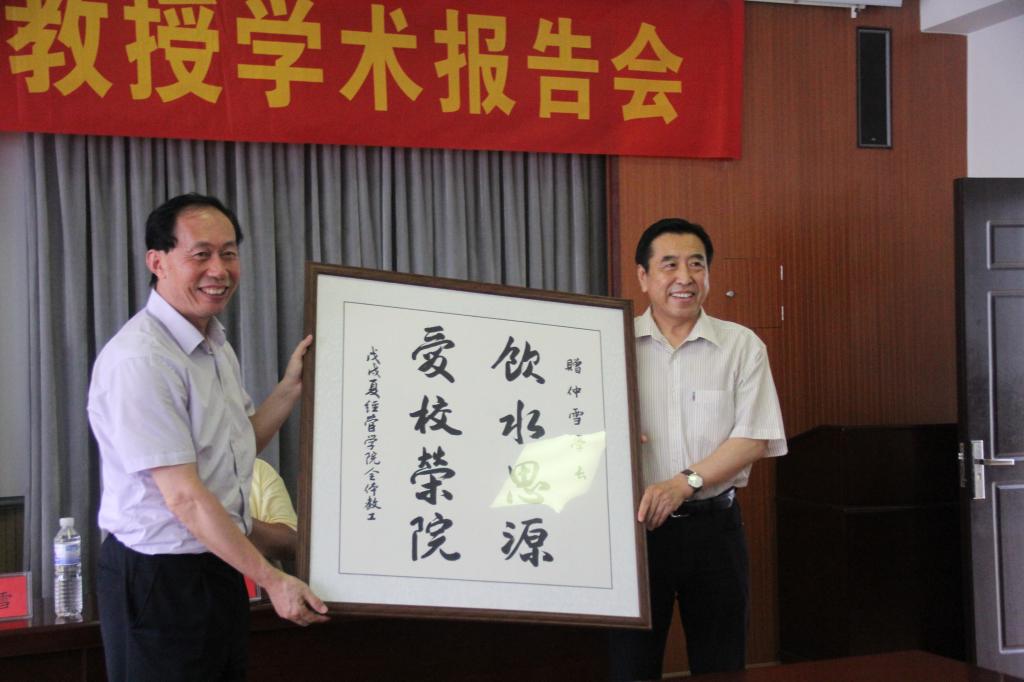 经管学院院长王志宪代表经管学院给袁仲雪教授赠送了由德赢vwin体育官网登录原党委书记高清亲笔题写的匾额“饮水思源,爱校荣院”。