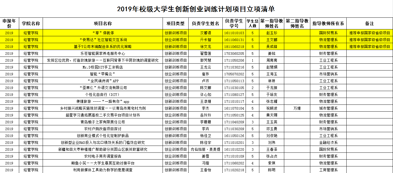 日前,创新创业教育学院公布了2019年校级大学生创新创业训练计划项目立项名单,经管学院21个项目立项2019年校级大学生创新创业训练计划项目,其中创新训练项目11项、创业训练项目10项。具体项目信息见附件。其中,学院有3个项目被择优推荐申报国家级、省级“大创计划”项目。