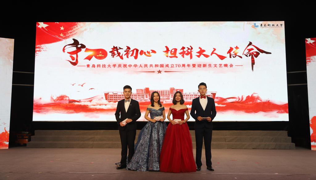 庆70华诞,谱科大新篇。在举国上下欢庆中华人民共和国成立70周年之际,为表示对2019级新同学的到来,学校“守70载初心 担科大人使命”——庆祝中华人民共和国成立70周年暨迎新生文艺晚会于2019年10月16日晚6时30分在崂山校区南苑运动场隆重举行。晚会分为“守初心庆华诞”、“担使命颂科大”两个篇章,德赢官网师生代表参与的节目在晚会演出过程中大放异彩,倍受好评。