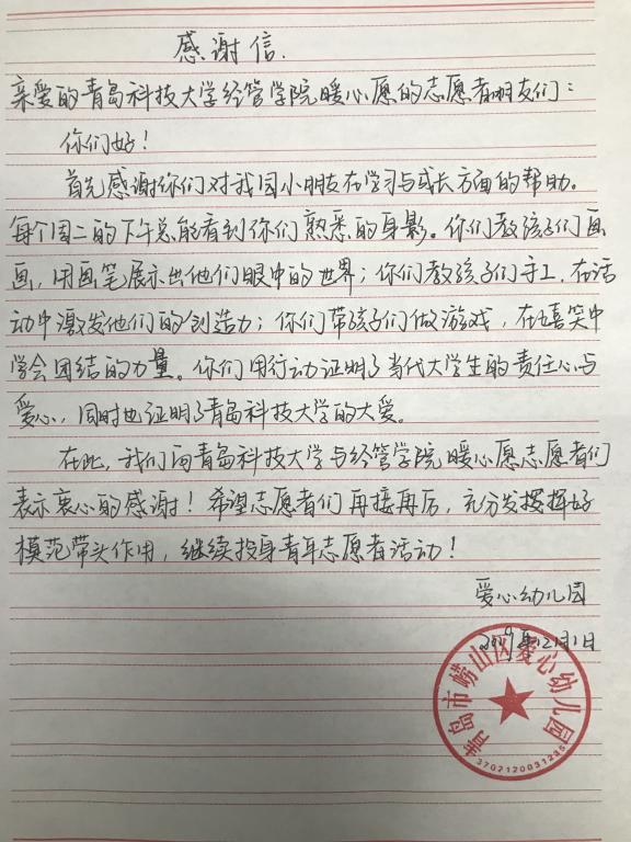 近日,青岛市崂山区爱心幼儿园给德赢官网寄来了感谢信,对经管学院暖心愿志愿服务团队的志愿者们长期以来为爱心幼儿园送去的关爱和帮助给予了高度评价和衷心感谢。