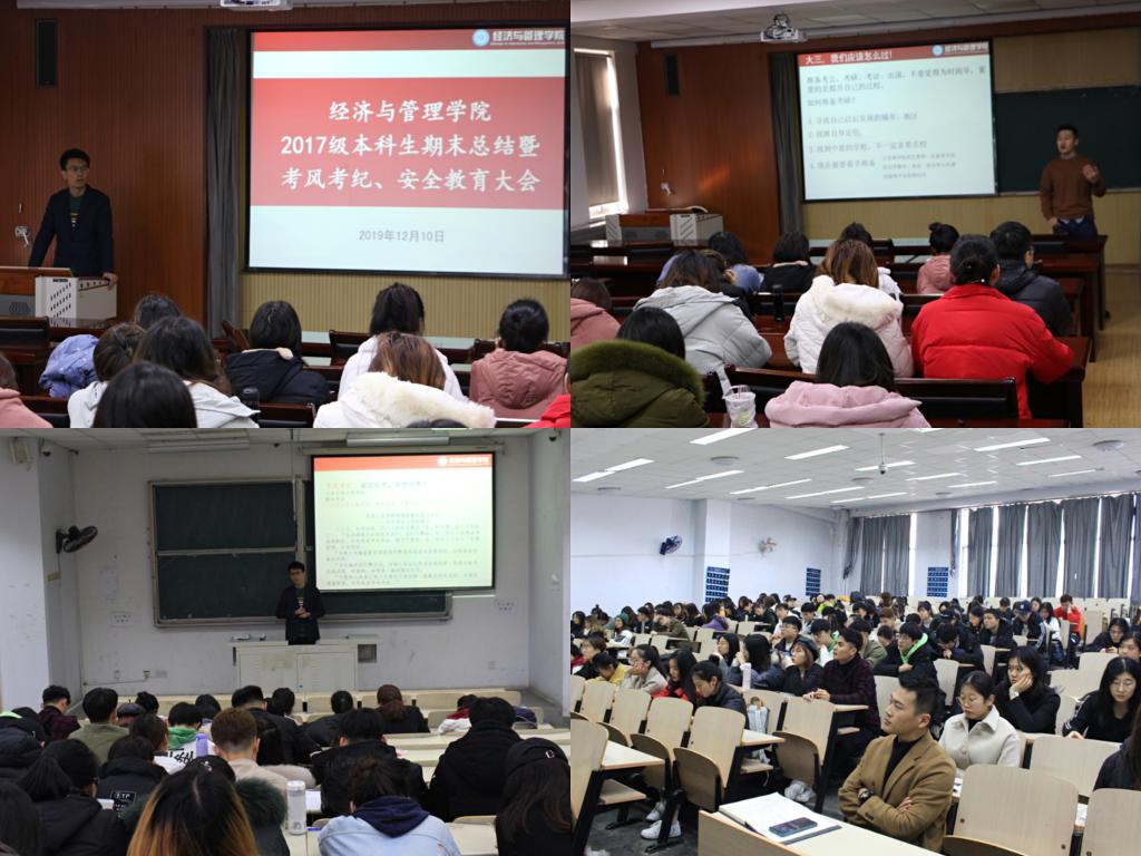 为进一步加强学风建设,严肃考风考纪,提升学生诚信意识,落实学校学院关于期末考风考纪和安全教育的工作要求,12月10日,经管学院2017级本科生于弘毅楼E302室分专业召开期末总结暨考风考纪、安全教育大会。本次大会由17级辅导员张显全老师、马梓轩老师主持,17级全体学生参加。