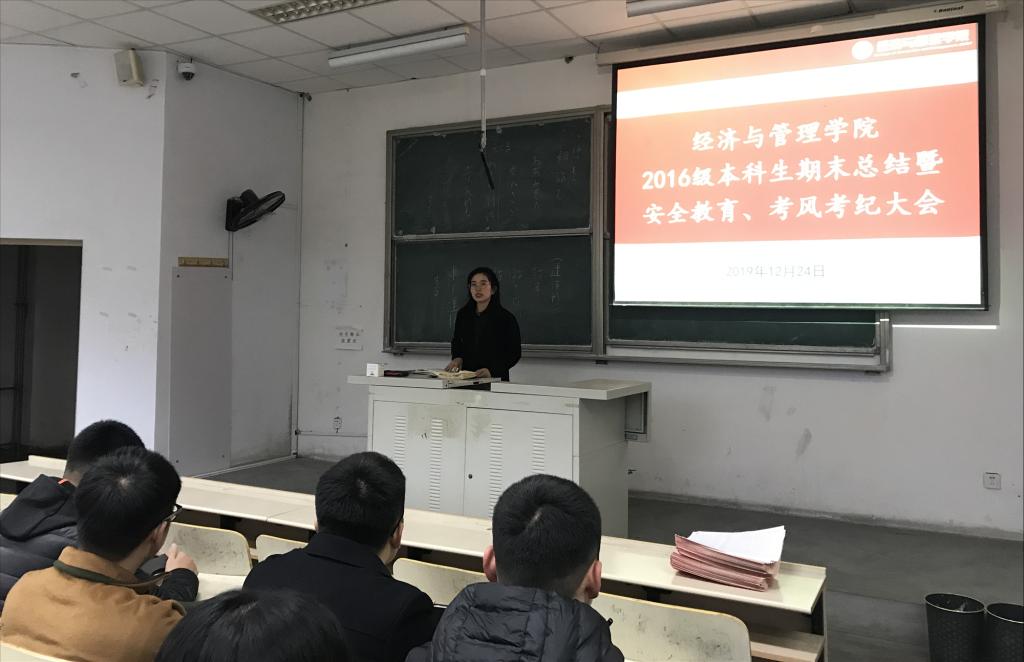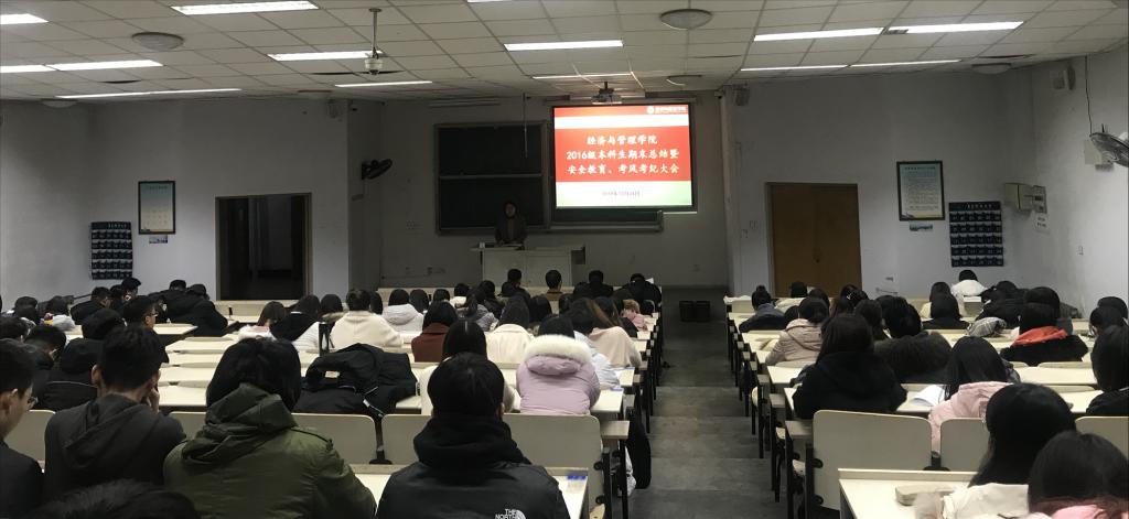 为进一步贯彻落实学校、学院关于防诈骗、考风考纪、安全教育、就业指导的工作要求,深入增强学生安全防范意识,巩固提升学院学风建设,12月24日,经管学院2016级本科生于弘毅楼E302室召开期末总结暨安全教育、考风考纪大会。本次大会由16级辅导员王聪、付凯主持,16级全体学生参加。