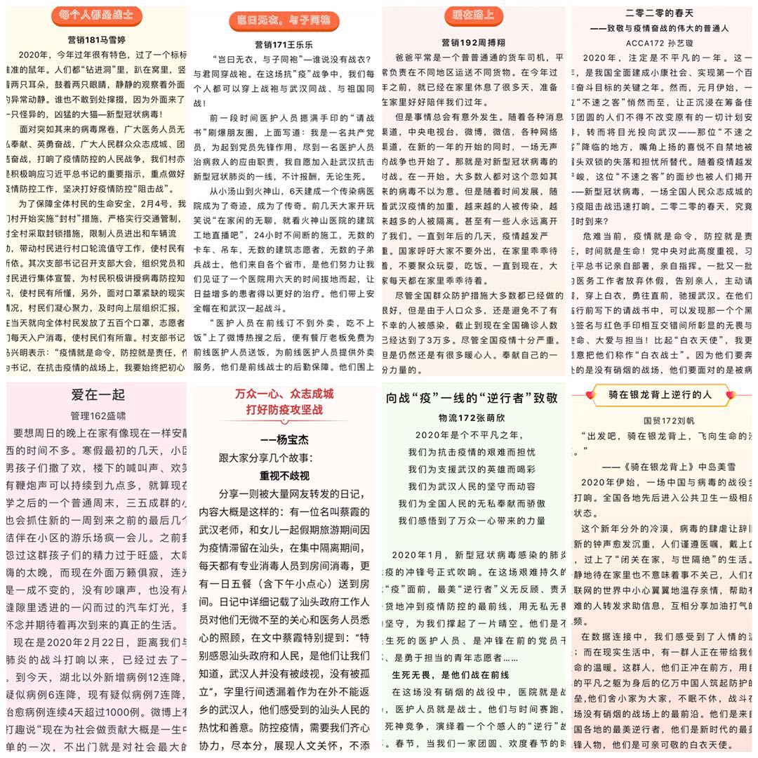 经管学院举办“我身边的战‘疫’故事”、“党旗红,众志城——防控阻击,我们‘战’在‘疫’起”作品征集活动,截止目前共收到168篇文稿,鼓励青年学子通过文字弘扬青春能量,抒写爱国情怀,畅谈作为学生党员对此次疫情的所感、所得,讲述身边军民携手、团结一致抗疫防疫的动人事迹,讴歌逆流而上、奋战在疫情救治、防控第一线的医生、护士、军人,科学家、志愿者、社区工作者等新时代英雄。