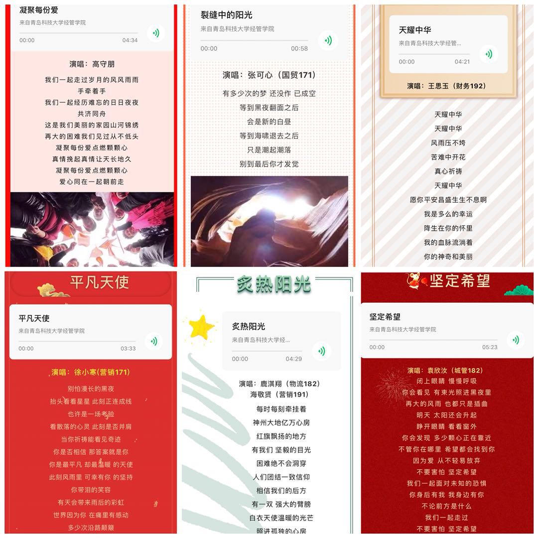 经管学院组织开展“以‘经’心之歌 传战‘疫’之情”活动,教师代表和教师代表和青年学生们通过歌曲录制的形式助力疫情防控宣传工作。其中,18级辅导员高守朋老师歌唱《凝聚每份爱》,致敬可爱的逆行者们,歌颂了他们义无反顾、连夜奋战的崇高精神;物流182班鹿淇翔和营销191班海敬贤合唱《炙热阳光》,用歌声传达了全国人民上下一致抗击疫情的决心,倡导青年学子应时刻不忘初心,牢记力重千钧的使命担当。此外,还有国贸171张可心、财务192王思玉等26名同学,共同为战“疫”献声,以音传情。