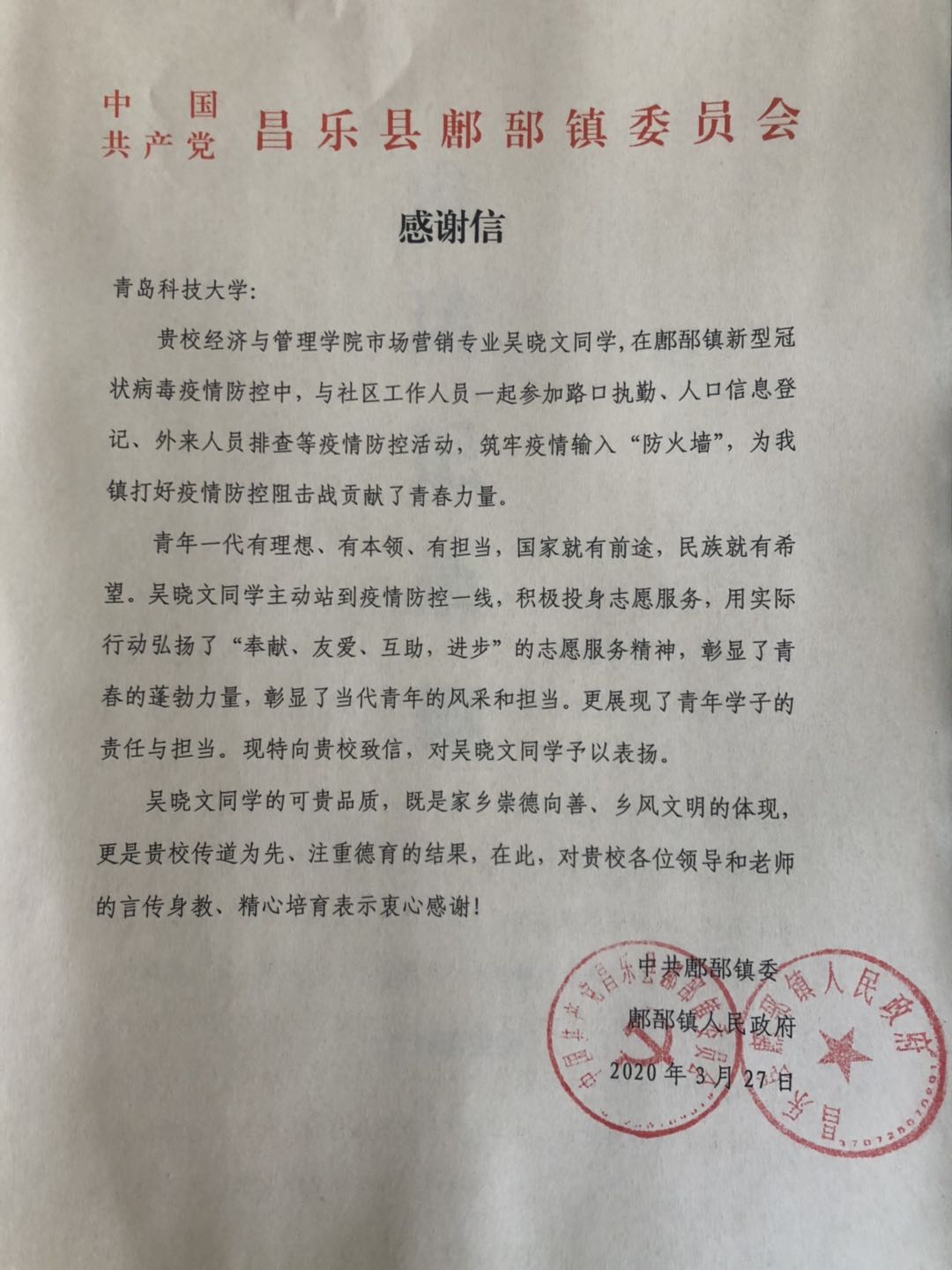 经管学院市场营销专业161班的吴晓文同学在疫情期间,主动请缨,投身到家乡潍坊市昌乐县鄌郚镇的新冠肺炎疫情防控工作中,与社区工作人员一起负责路口执勤、人口信息登记、外来人员的防疫排查等工作,用一丝不苟的工作要求和严肃认真的工作态度筑牢当地村镇疫情输入的“防火墙”,获得镇党委的公开表扬信。