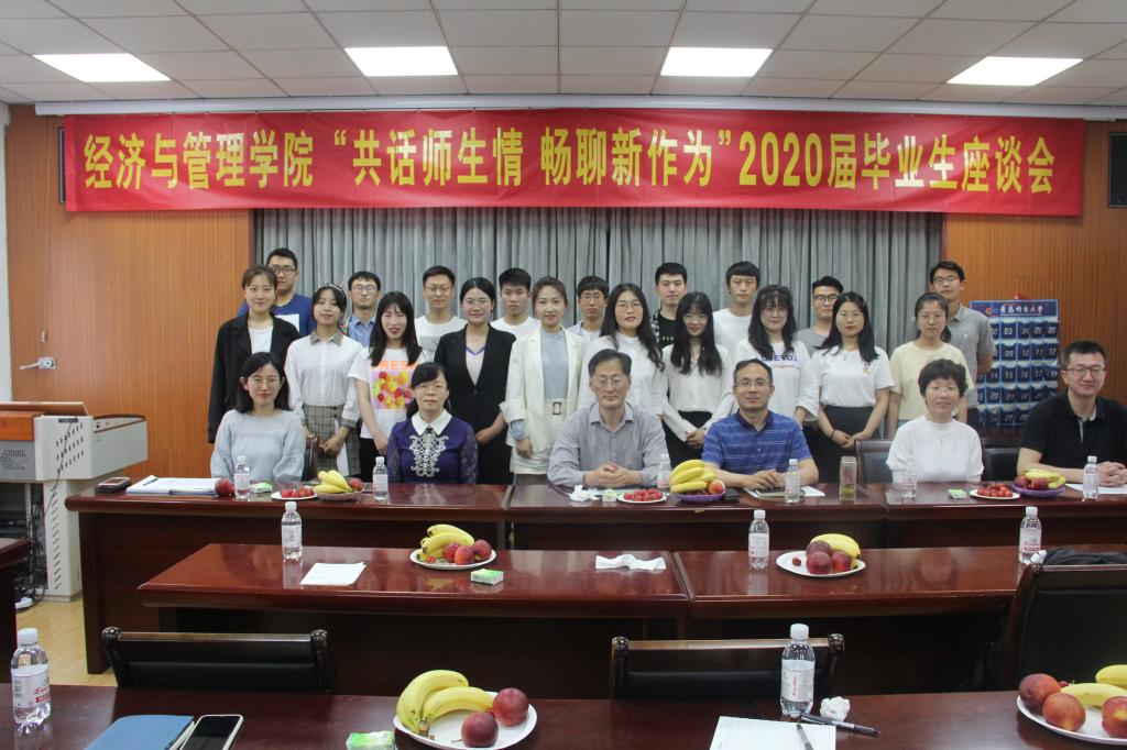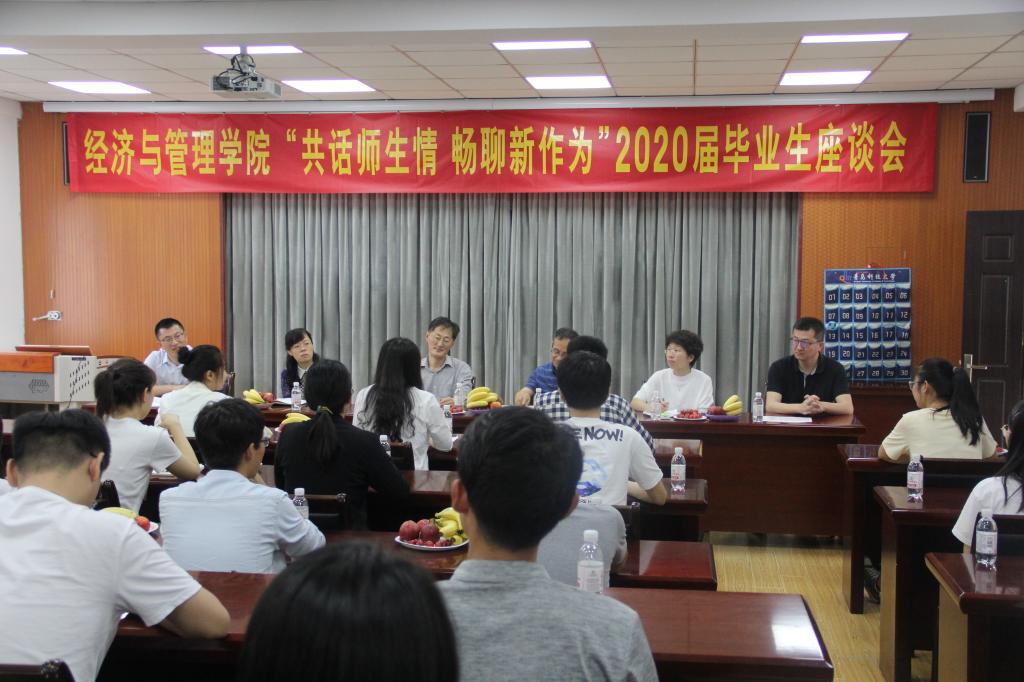 浓浓惜别意,依依不舍情。6月12日下午,经管学院“共话师生情 畅聊新作为”2020届毕业生座谈会在经管楼419会议室如期举行。经管学院院长李勋来、党委书记李德成、党委副书记刘跃宁,教师代表工商管理系董华、城市管理系宫攀、金融与经济学系吕承超,2016级辅导员王聪、付凯,以及各专业优秀毕业生代表共同参加了此次座谈会。座谈会由刘跃宁主持。