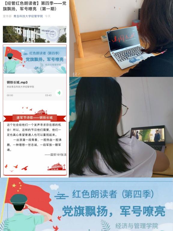 追寻红色记忆,筑牢思想之基。学院创新学生党支部特色活动“红色朗读者”展示形式,融入新时代强军主题,推出“党旗飘扬,军号嘹亮”第四季朗读系列及“军旗扬,军歌响”歌曲传唱活动,同学们感情真挚、字字铿锵,用作品诠释了爱国爱党爱军精神。通过官网、官微、易班等渠道开展的“同庆建军节,共叙鱼水情”活动中共收到画作、寄语、海报等优秀作品百余份,形式多样,富有创意,正面引导青年学子传承和发扬中国军人精神。