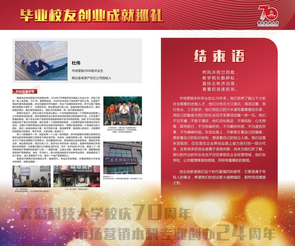 值此校庆70周年之际,德赢官网市场营销本科专业创办满24周年,为此,经管学院市场营销系举办了毕业校友创业成就展览,收集了历届校友创业创新活动取得杰出成就的部分素材,制作展览栏于弘毅楼门口进行集中展示。
