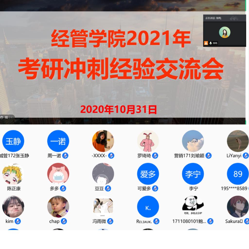 为进一步提高学生的考研热情与考研效率,促进学院学风建设,10月31日下午,经管学院2021年考研冲刺经验交流会于线上圆满举行,百余名17级学生聆听了本次交流会。