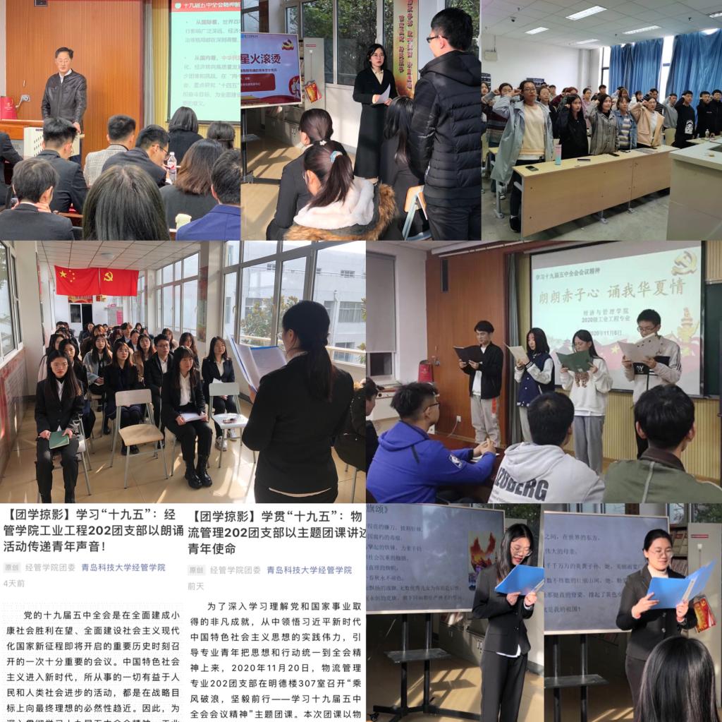 经管学院党团互联,拓宽组织育人及实践育人双重体系。院党委书记作《十九届五中全会精神解读》主题团课,启发全体青年坚持正确政治导向,自觉做到自我价值实现与国家发展同向而行。党支部开展《厚植信仰、星火滚烫》主题党课,以全会内容为根本为广大党员开展理想信念教育;开展“传承红色经典、诵读红色精神”主题党日活动,挖掘十九届五中全会蕴含的红色教育资源,发挥“红色朗读者”的活动品牌效应,构建党建育人模式一脉相承。各团支部开展“学贯十九五”系列活动,以“朗朗赤子心,诵我华夏情”主题团日活动、《十九届五中全会与我》主题团课活动、“我的使命我的团”主题演讲活动、十九届五中全会主题征文活动等,引导学生自我教育、自我管理、自我服务,全面实现十九届五中全会精神入脑入心。