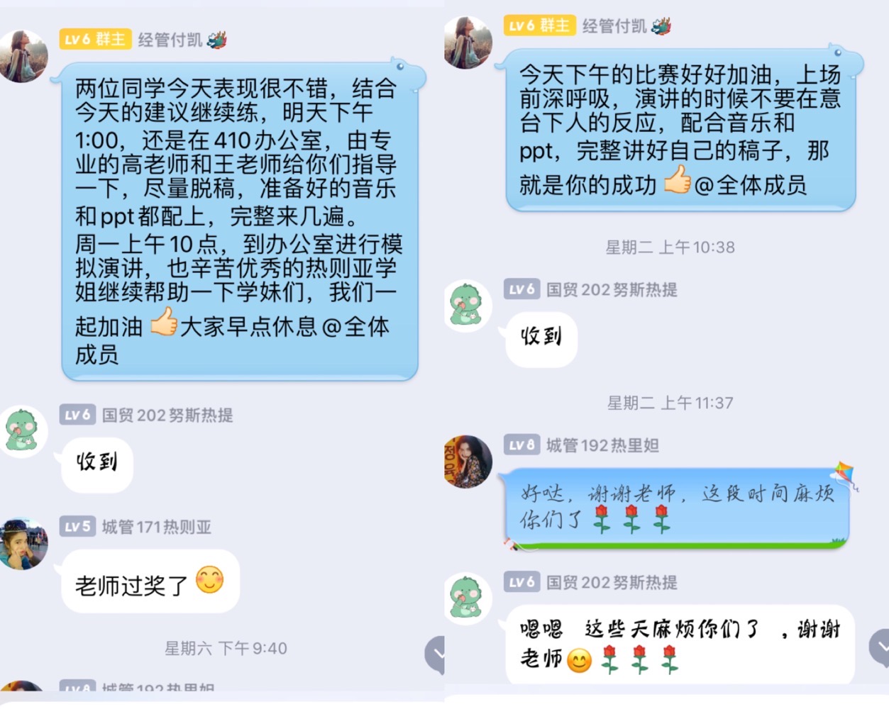 为弘扬中华民族共同体意识,同时为提升少数民族同学家国荣誉感、民族幸福感与集体归属感,学院积极组织发动学生参赛,少数民族学子热情配合,兴致昂扬,最终共有4名同学报名参赛,贯穿学院全部年级。经学院初步选拔,最终拟定2019级城市管理专业热里妲与2020级国际经济与贸易专业努斯热提同学参加校赛。为确保参赛质量,赛出经管学院学子风采,辅导员老师高度重视,线上线下齐调度,帮助学生修改稿件、指导排练、选配音乐、制作背景图。经多次完善,两位同学携以自信与从容走向校赛现场。