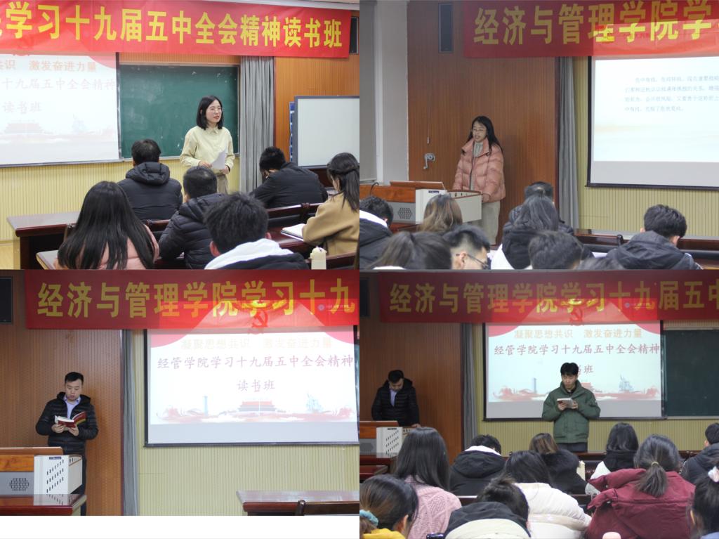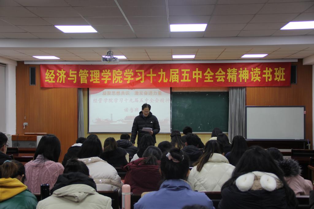 在全国上下掀起学习领会十九届五中全会精神、学习习近平总书记重要讲话精神热潮的重要节点,在学校做出全面学习贯彻十九届五中全会精神重要部署的关键时期,经管学院以学校学习安排部署为引领,结合学院教育工作实际,于2020年12月1日晚在经管楼419室顺利举行“凝聚思想共识 激发奋进力量”十九届五中全会精神读书班开班仪式暨读书班第一课,经管学院党委书记李德成、全体专兼职辅导员、全体研究生、本科生党员及学生骨干参加,开班仪式由学院学工办副主任、团委副书记王聪主持。