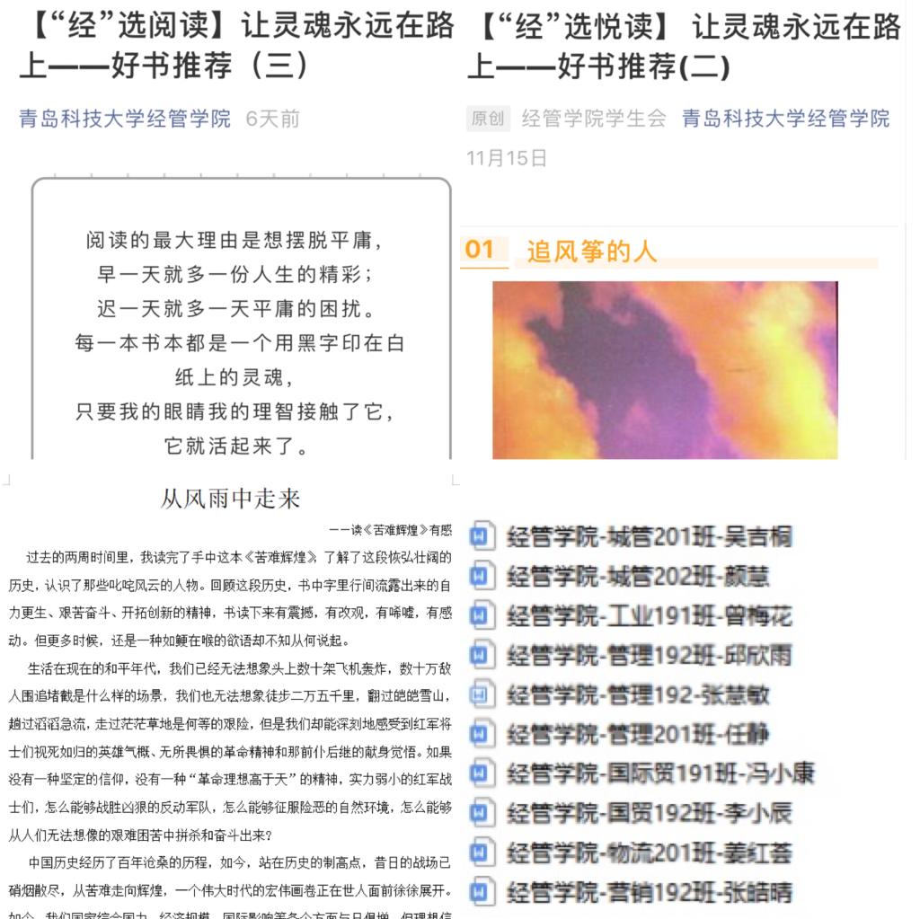 同时,经管学院利用线上线下同时发力,通过微信公众号、经管小石头、易班等线上平台开展“好书推荐”系列活动,经管学子通过热烈讨论,交流心得,深化读书感想,指导自身行动,并号召全院学生培养读书习惯,争做读以修身,涵养品德的先行者,做传承经典、引领风尚的实践者。同时,学院组织学生在阅读后撰写心得感悟,交流读书体会,将所想所感付诸笔尖,进一步将读书意识在实践中传播与秉承。