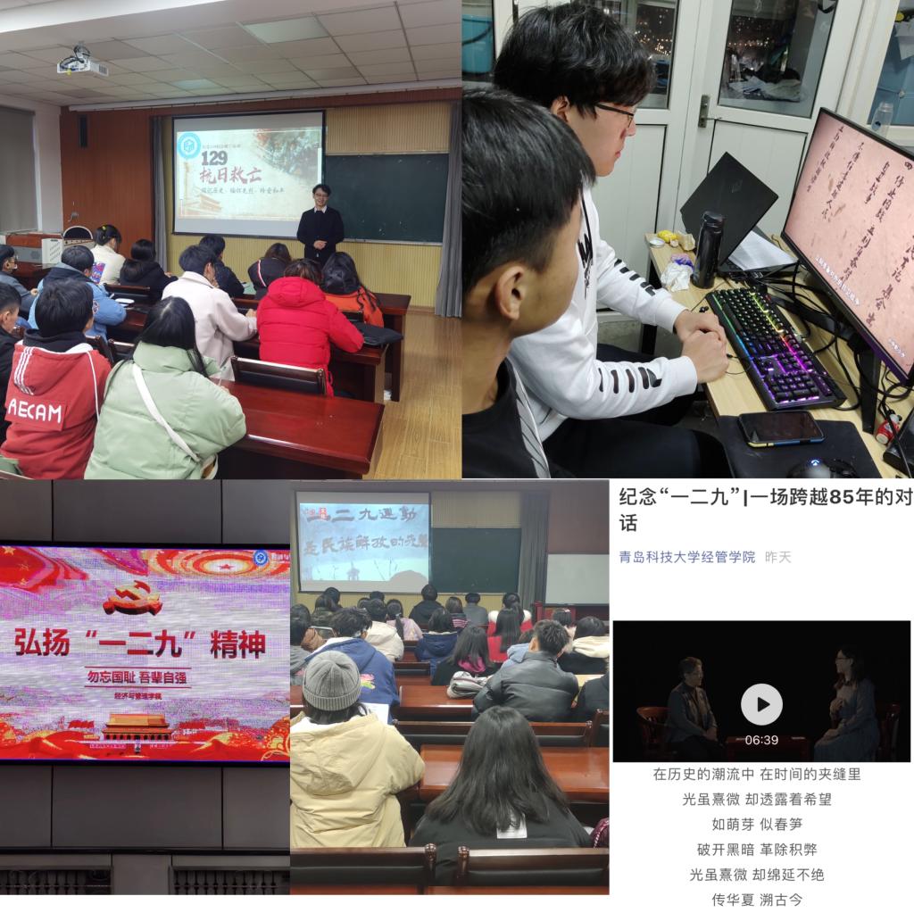 经管学院组织各年级各专业陆续开展“纪念‘一二·九’”主题团日活动,以爱国教育为主线,各团支部组织团员观看《我和我的祖国》、《集结号》、《八佰》等红色影片,片中革命先烈英勇奋斗、至死不渝的品质,让同学们受到了心灵的净化和精神的洗礼。此外,学院号召学生观看学习“一二·九”运动党史课堂、微视频等,以集中观看与自发组织的形式,真切了解“一二·九”运动中青年学生所体现的壮志满怀。同时,学院通过微信和QQ官方平台展开党史微教育,并通过学院电子屏幕循环宣传带动,落实爱国主义教育着力点,强化立德树人实效性。