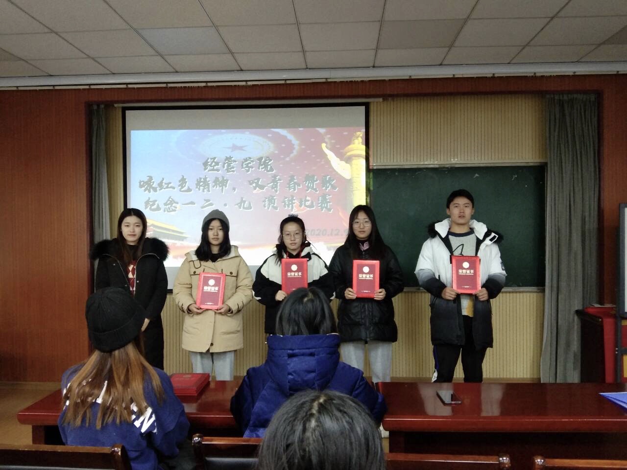 经管学院举办“咏红色精神,叹青春赞歌”主题演讲比赛,选手们分别以《85年后的回眸》《红旗飘飘》、《渴望光荣》、《我们这样爱国》、《我骄傲,我是中国人》等为主题,深刻缅怀了“一二·九”运动中革命先烈的英勇事迹,并将中国青年在抗战中的卓越成绩同自身发展、民族复兴和时代要求相结合,以“青春告白”涵育爱党爱国爱社会主义的真挚情感,以“固本培元”推动中共党史、新中国史、社会主义发展史教育入脑入心,加强“四史”教育的氛围营造和文化浸润,引导学生传承红色基因,勇做走在时代前面的奋进者、开拓者、奉献者,为实现伟大复兴的中国梦奉献智慧和力量。