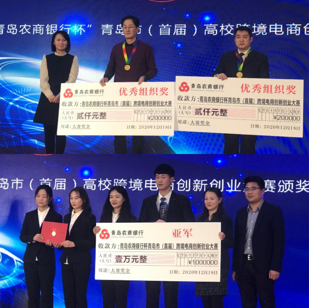 12月18日,青岛市(首届)高校跨境电商创新创业大赛授奖仪式隆重举行,国际经济与贸易系张同功老师指导的“云霄战队”斩获本次大赛亚军。德赢vwin体育官网登录同时获得本次大赛的优秀组织奖,经管学院党委书记李德成出席了授奖仪式。