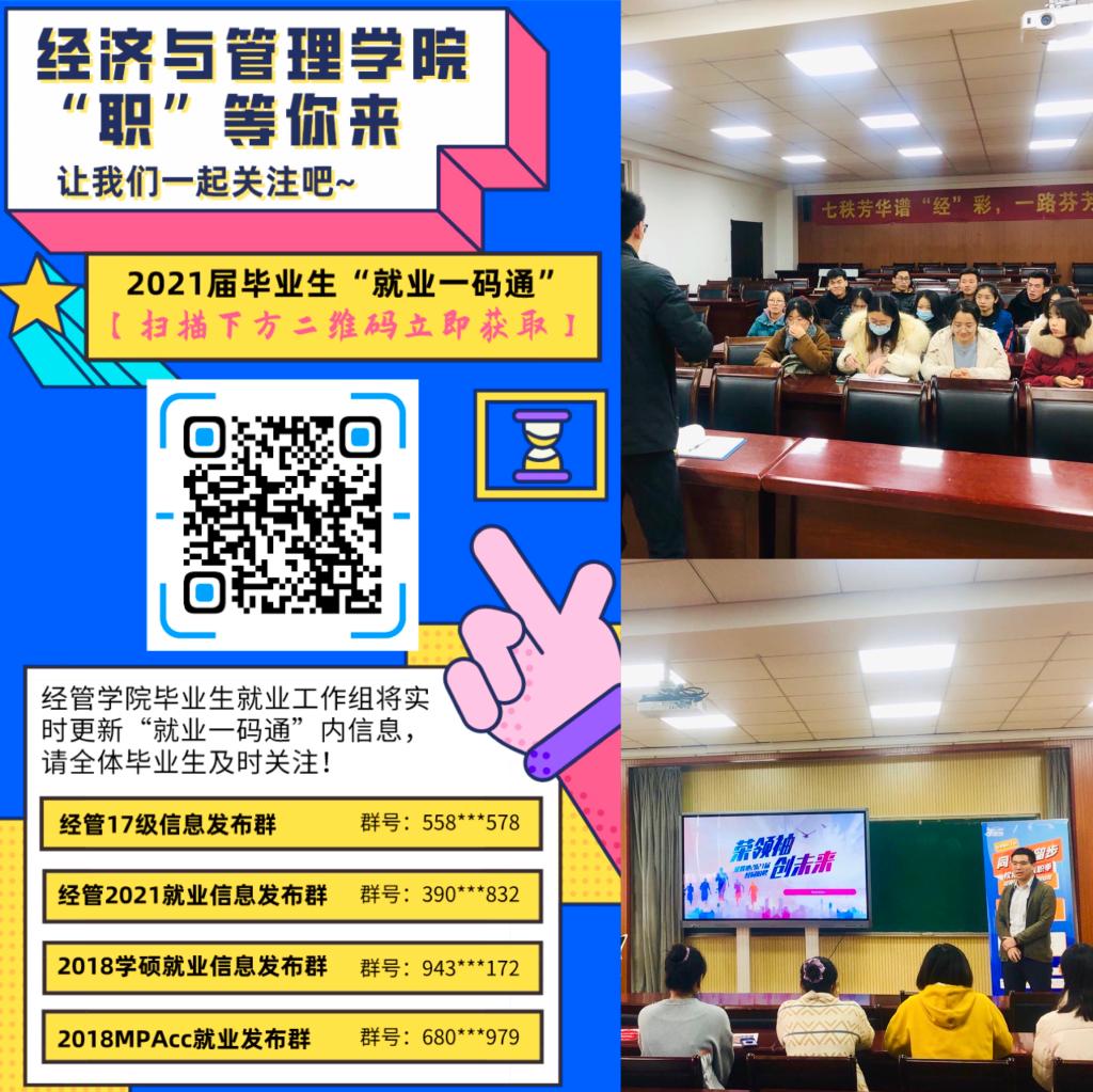 为更好地促进2021届毕业生升学深造、求职就业,经管学院自11月起,着力构建“学院后盾、年级助力、学生融合”一以贯之的“大就业”管理格局,以“精准识别、精准指导、精准保障、精准帮扶”为原则,精准打造“考研+就业”全矩阵,多措并举助力广大毕业生以昂扬斗志克服疫情影响,直面就业挑战。