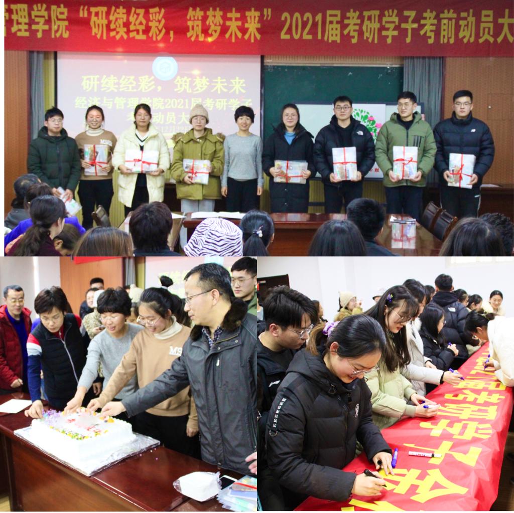 12月22日下午,经管学院“‘研’续‘经’彩,筑梦未来”2021届考研学子考前动员大会于经管楼419正式召开。经管学院副院长宫攀、各系主任、2017级辅导员及考研学生代表参加动员会。会上,各专业考研学生代表依次汇报了近期复习状态及备考情况,学生们从报考院校专业、复习历程、心理状态、学习方法等角度进行汇报,与会老师分别为考研学生做考前动员和祝福,从复习建议、心态调整、精神砥砺等角度系统做出具体指导。同时,学院还为全院300余名考研学子赠送“考研加油包”、准备“祝福蛋糕”,以考试专用文具、专属定制照片、温馨祝福帖等细节服务打造坚实后盾保障,助力学子旗开得胜、勇折桂枝。