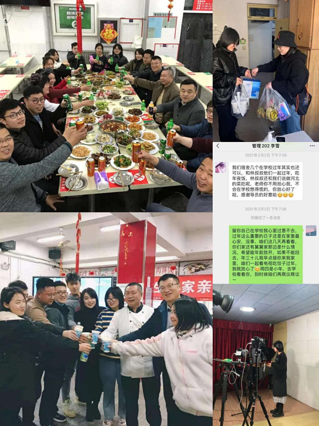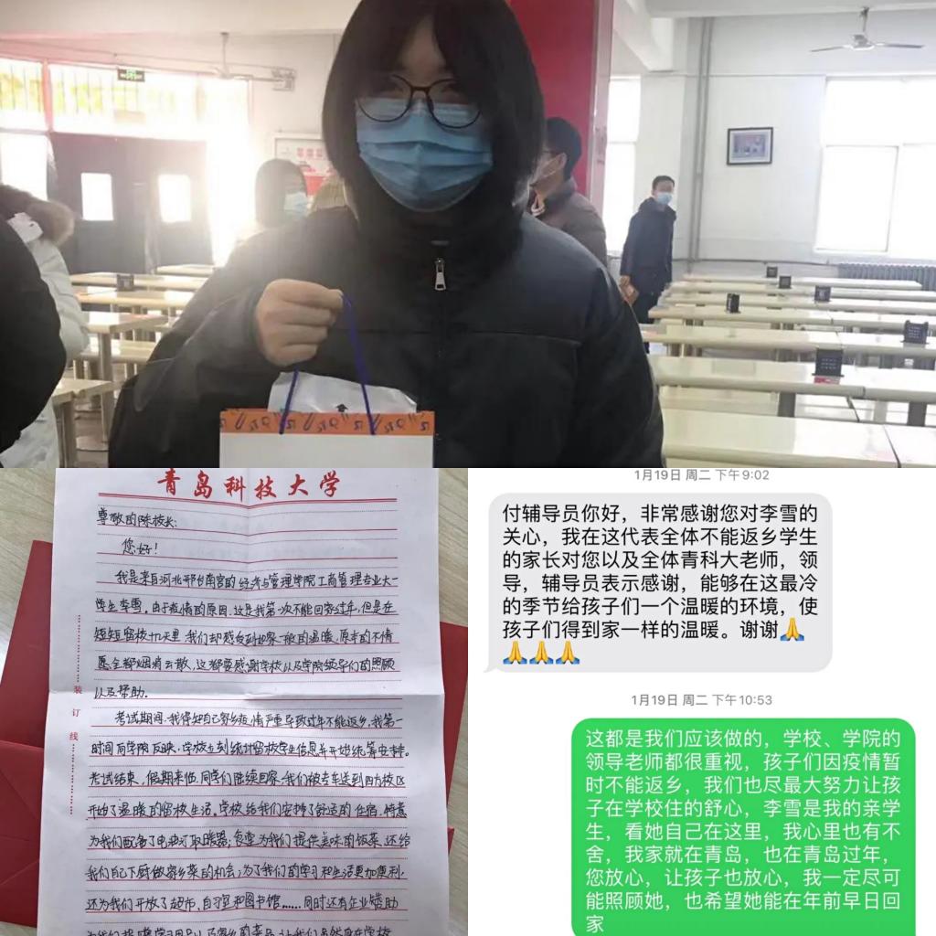 建立院领导-辅导员-班主任-党团骨干“四线联络”机制,实施家校合作“3个1”计划,即:每日1次线上联络学生、每日1次学生安全反馈、每周1次与学生家长视频通话,及时协调解决学生在生活、学习、实践等方面的实际困难。学院领导、辅导员驻地值班,在小年、除夕、正月十五等节日当天到校看望学生并聚餐,送去祝福礼包,让“不能回家”变成“留在家里”。此外,学院辅导员还与学生一同参与了青科大留校师生版本《一封家书》的MV录制,道出万千就地过年学子的心声,也同样为他们注入了与家乡亲人共同抗疫的强大精神力量。