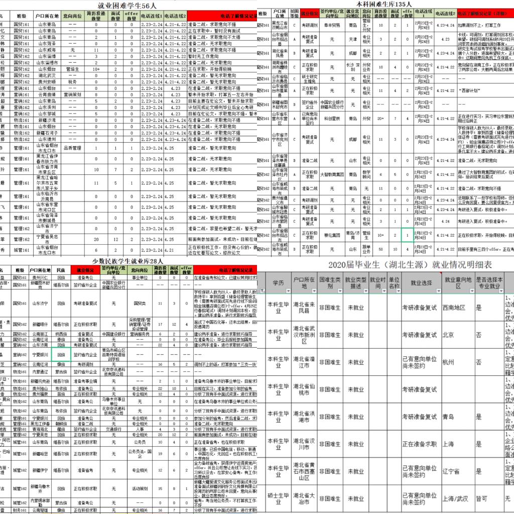 开展分类帮扶,确保就业指导服务“不断线”。学院将每年3月定为就业促进月,建立家庭经济困难学生(137人)、女生(338人)、考公考编(41人)、少数民族学生(27人)、学业困难学生(21人)及非全日制研究生(89人)6个数据库,加强对疫情严重地区毕业生倾斜帮扶,建立湖北籍学生(8人)就业服务微信群,实施“点对点”“一生一策”帮扶。针对新疆籍少数民族大学生(8人)、新疆籍汉族学生(10人)开展就业专题培训5次,通过培训,学生的语言表达、团队合作、沟通协调能力均得到提升。做好“一对一”就业指导服务,坚持为每名毕业生提供“一系列简历修改、一系列深度咨询、一系列岗位推荐”的“三个一”指导,用好心理咨询,疏导毕业生焦虑。受疫情影响宿舍关闭,在毕业生考研、求职期间,辅导员代替下宿舍进行“一对一”物品领取76人,累计打印政审表123份,成绩单134份,完成就业协议、成绩单、个人证书邮寄169份,全心全意为学生做好暖心服务。