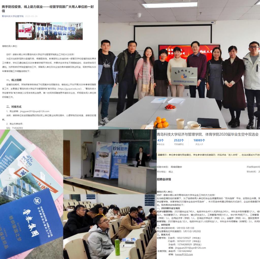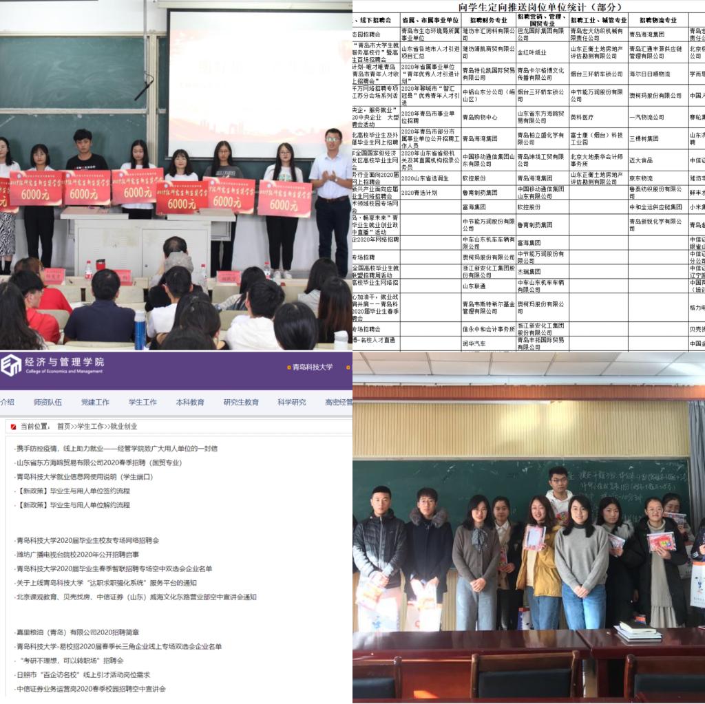 经管学院主动对接用人单位,畅通信息渠道,确保人才供需“不掉线”。延伸市场“前端”,积极请进来,学工办(团委)集中举行“职在必得 筑梦未来”线下招聘会2场,从来自全国各地近200 家用人单位中优选出50家专业契合好、薪资水平高、发展前景广的优质企业,提供就业岗位1100余个。各系通过走访对口企业、组织学生实习、联系校友企业、签订实习基地等方式全力维护就业市场,七个专业先后邀请顺丰、青岛啤酒、TATA木门、东软集团等 40 余家针对性高、专业性强、行业知名的企业开展“小型化、专业化、特色化”招聘会14场。疫情期间发布《经管学院致用人单位的一封信》,主动介绍防控期间线上招聘流程,联合人文社科七个学院举办“2020届毕业生空中双选会”,线上精准推送招聘企业212家,提供就业岗位650余个。深挖资源“后端”,积极走出去,充分发挥校友资源,密切联系合作企业、校友企业,开拓北上广就业市场,新增实习基地14家,开拓就业单位53家,提供就业岗位220余个,打通用人单位与毕业生间的“最后一公里”。畅通信息“终端”,构建“学院网站就业模块+微信公众号+QQ群+微信精准推送”信息发布平台矩阵,分地区给毕业生建群22个(山东351人,新疆18人,贵州16人,宁夏16人,云南12人,黑龙江10人,内蒙古10人 ....),累计为毕业生推送岗位2000余个,实时准确掌握就业进展,做到“日日清”“周周明”。