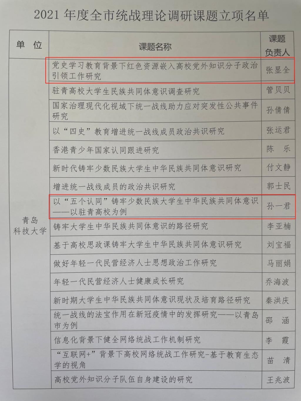近日,中共青岛市委统战部下发《关于公布2021年度全市统战理论调研课题立项名单的通知》,根据通知精神,德赢vwin体育官网登录共有立项25项,其中,经管学院获批2项。经管学院申报的课题《党史学习教育背景下红色资源嵌入高校党外知识分子政治引领工作研究》(负责人张显全)和《以“五个认同”铸牢少数民族大学生中华民族共同体意识—以驻青高校为例》(负责人孙一君),均获得2021年度统战理论调研课题立项。