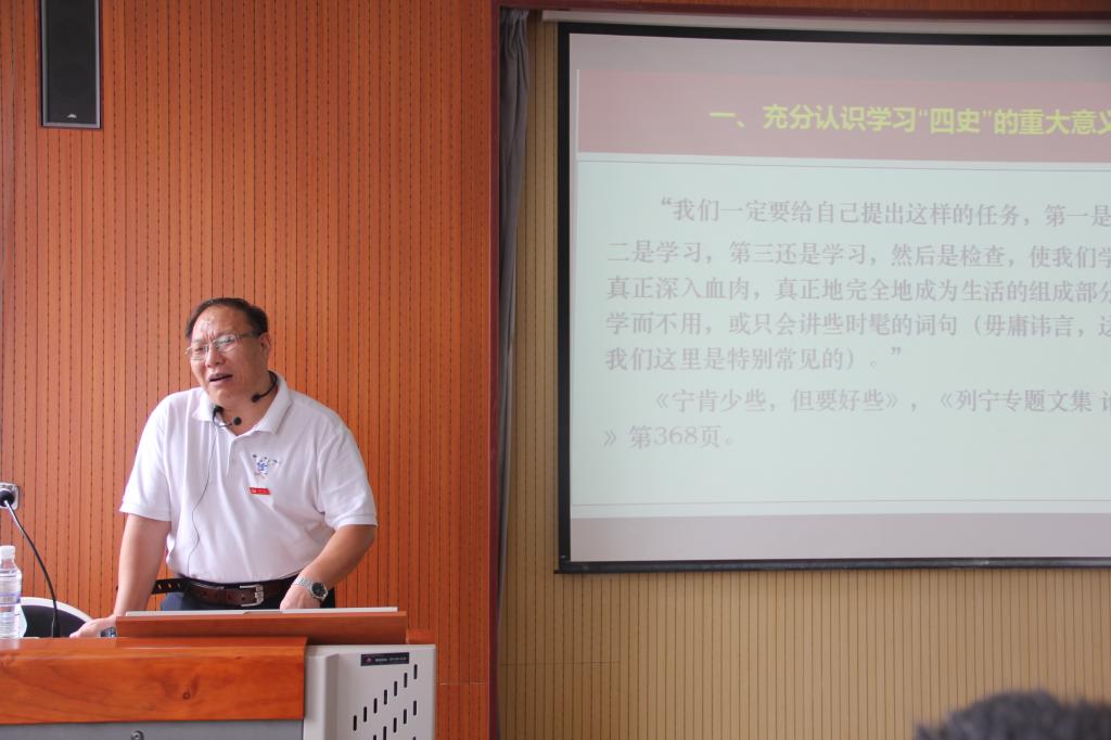 曹胜教授以“学习四史,践行初心使命”为主题,围绕习近平总书记在学习党史、国史方面的相关论述,从“四史”学习教育的重大意义、如何有效开展“四史”学习教育及“四史”学习教育的主要内容等三个方面进行解读,通过对历史规律的深入分析、历史与现实的比较,对历史虚无主义进行了深刻批判。他指出,习近平总书记曾强调:“学习党史、国史,是坚持和发展中国特色社会主义、把党和国家各项事业继续推向前进的必修课。这门功课不仅必修,而且必须修好。”学习四史,有助于加深对党的初心使命的体悟,筑牢不忘初心、牢记使命的思想根基,进一步增强政治意识、大局意识、核心意识、看齐意识,推动主题教育制度化、常态化、实效化。