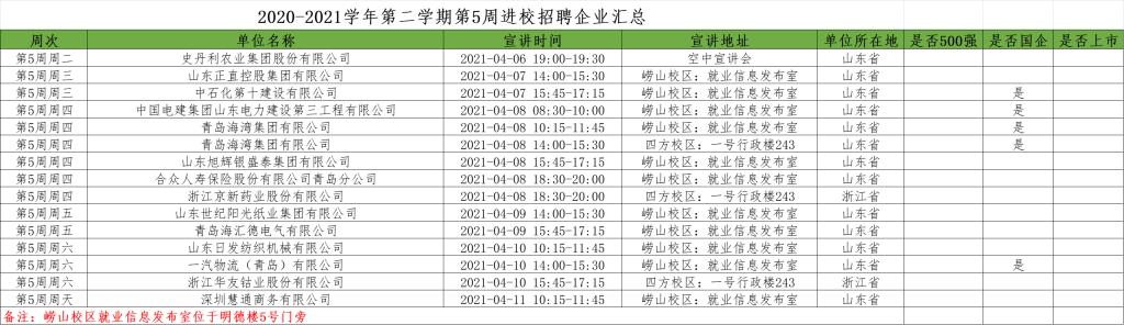 | 各位2021届毕业生: 2020-2021学年第2学期第5周,进入我校进行宣讲招聘的企业名单如下,均为涉及经管学院相关专业及不限专业的企业。请广大毕业生同学根据个人情况,按时参加企业宣讲会。