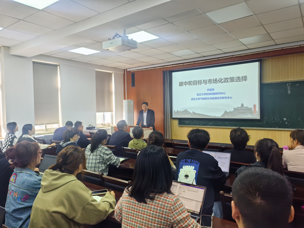 10月23日,武汉大学德赢vwin体育官网登录齐绍洲教授受邀,在经管楼419作题为“碳中和目标与市场化政策选择”的专题讲座。本次讲座由德赢vwin体育官网登录院长李勋来主持,学院教师、研究生同学参加此次讲座。